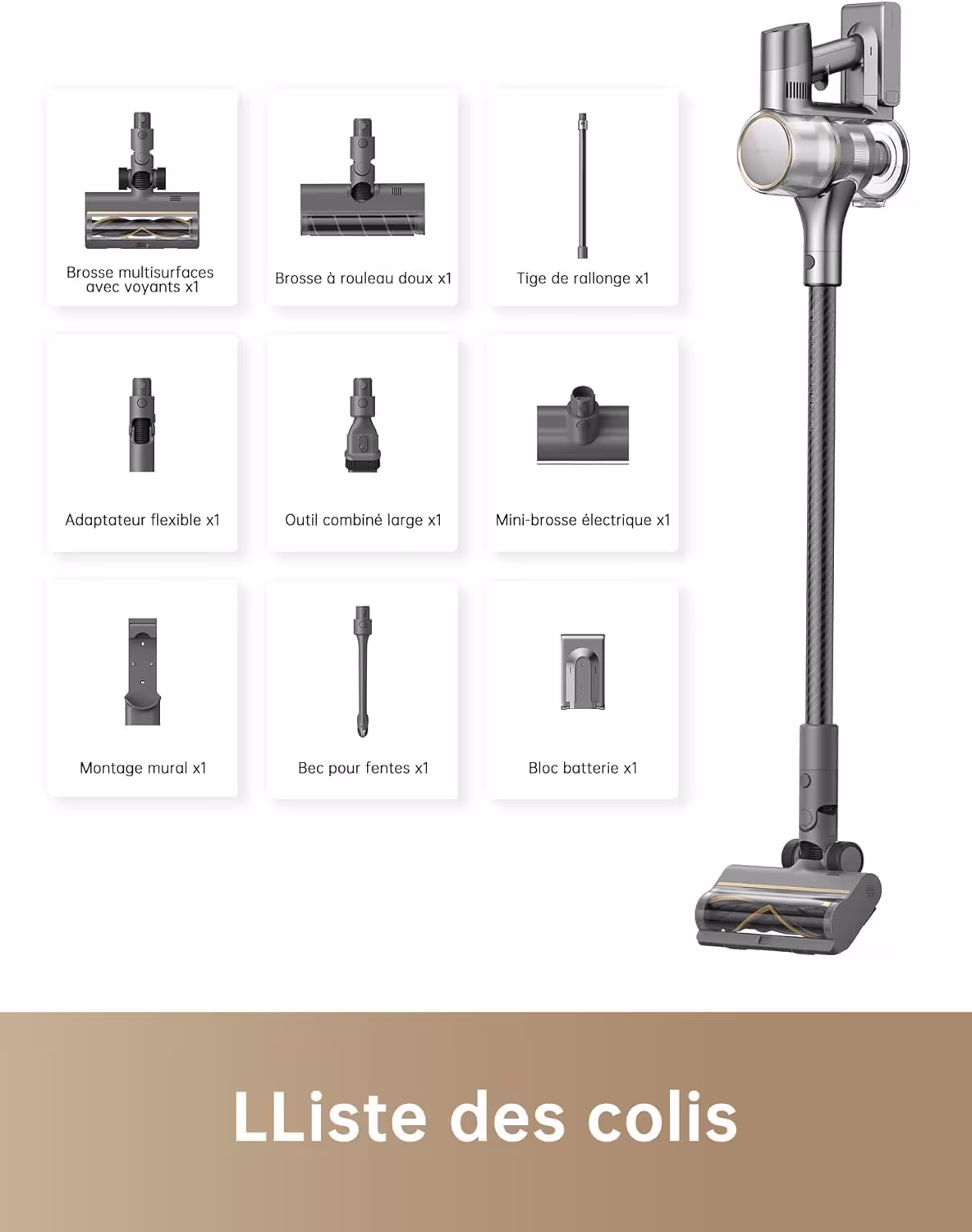 Le Dreame R20 combine 180 AW d'aspiration avec un ecran LCD couleur qui affiche le mode actif, la batterie restante et les alertes d'entretien en temps reel. Son poids de 1,75 kg le rend agreable a manipuler sur la duree, meme lors des sessions de menage entre les etages. Le tube flexible integre atteint les zones sous les meubles et derriere les canapes sans effort.