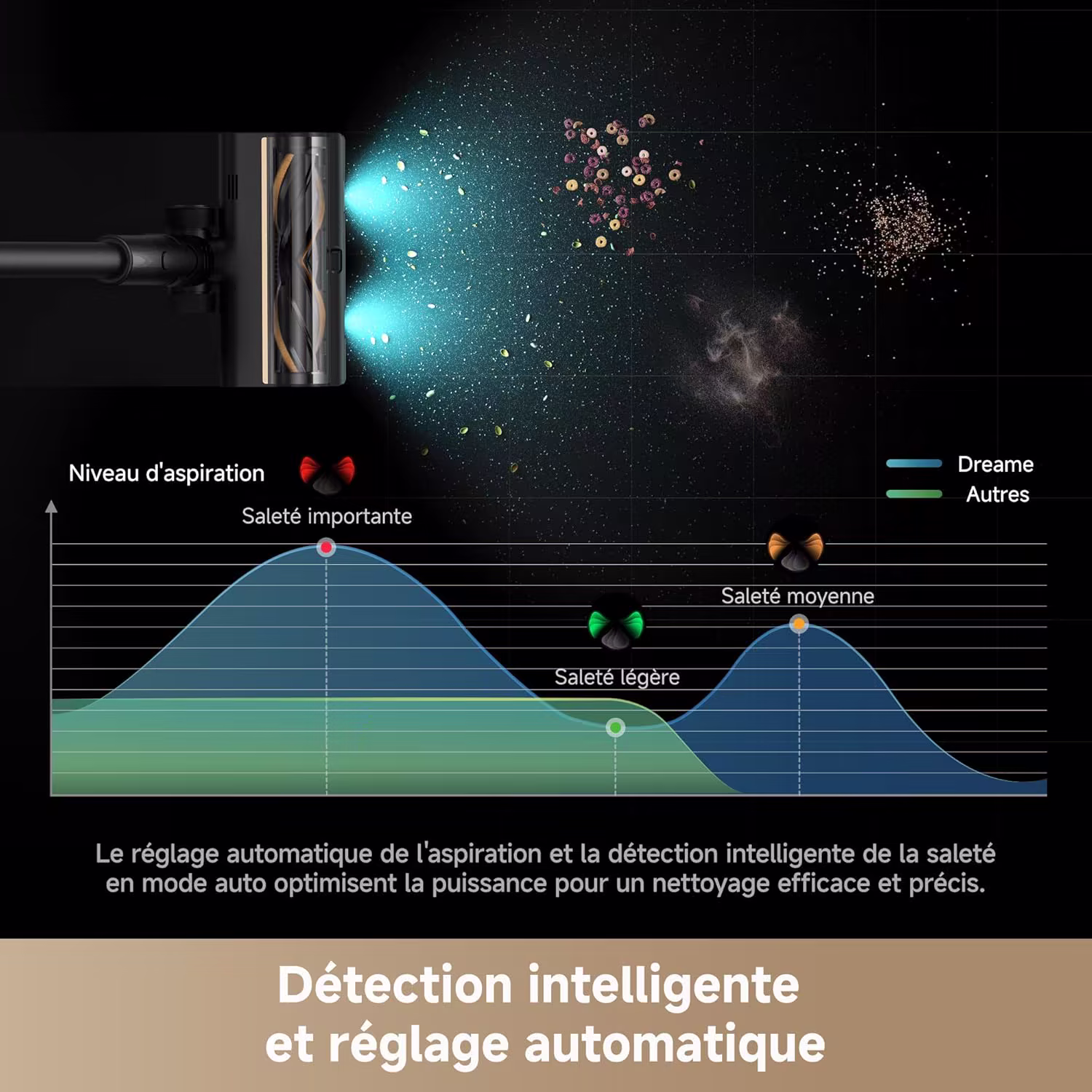 La brosse CelesTect multi-surface anti-emmelement previent l'accumulation de cheveux autour du rouleau. La detection intelligente des salissures ajuste la puissance automatiquement. Le bac de 0,8 L est le plus grand de la gamme d'aspirateurs balais Dreame, ce qui permet de nettoyer plusieurs pieces ou un etage complet sans interruption pour le vider.
