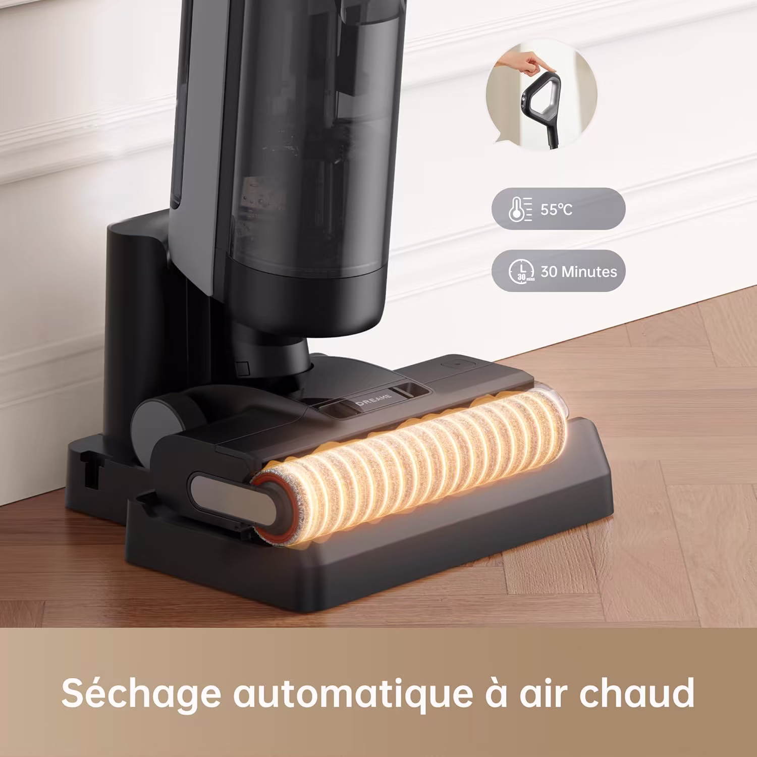 Apres chaque utilisation, l'auto-nettoyage rince la brosse a l'eau propre, puis le sechage a l'air chaud a 55 degres C pendant 30 minutes empeche toute proliferation de moisissures. Les 60 minutes d'autonomie couvrent facilement les grands espaces de vie, du rez-de-chaussee au premier etage, sans recharge intermediaire.