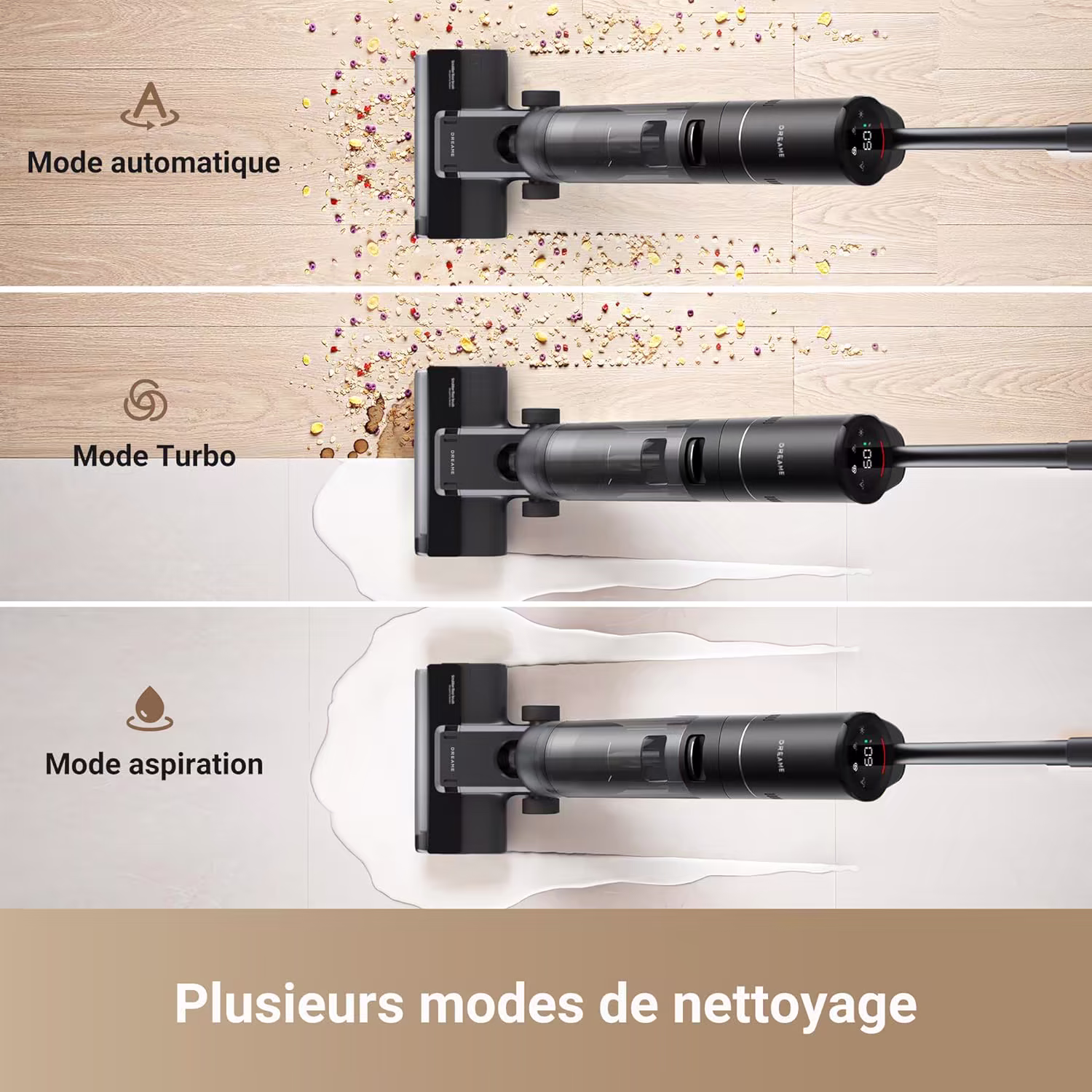 Le mode Auto s'appuie sur le capteur de salete integre pour ajuster la puissance en temps reel : il augmente l'intensite sur les zones encrassees et la reduit sur les surfaces propres. Le mode Turbo libere toute la force d'aspiration pour les taches tenaces. Le mode Aspiration aspire les liquides renverses sans activer le lavage, pratique quand un verre se renverse sur le carrelage de la cuisine.