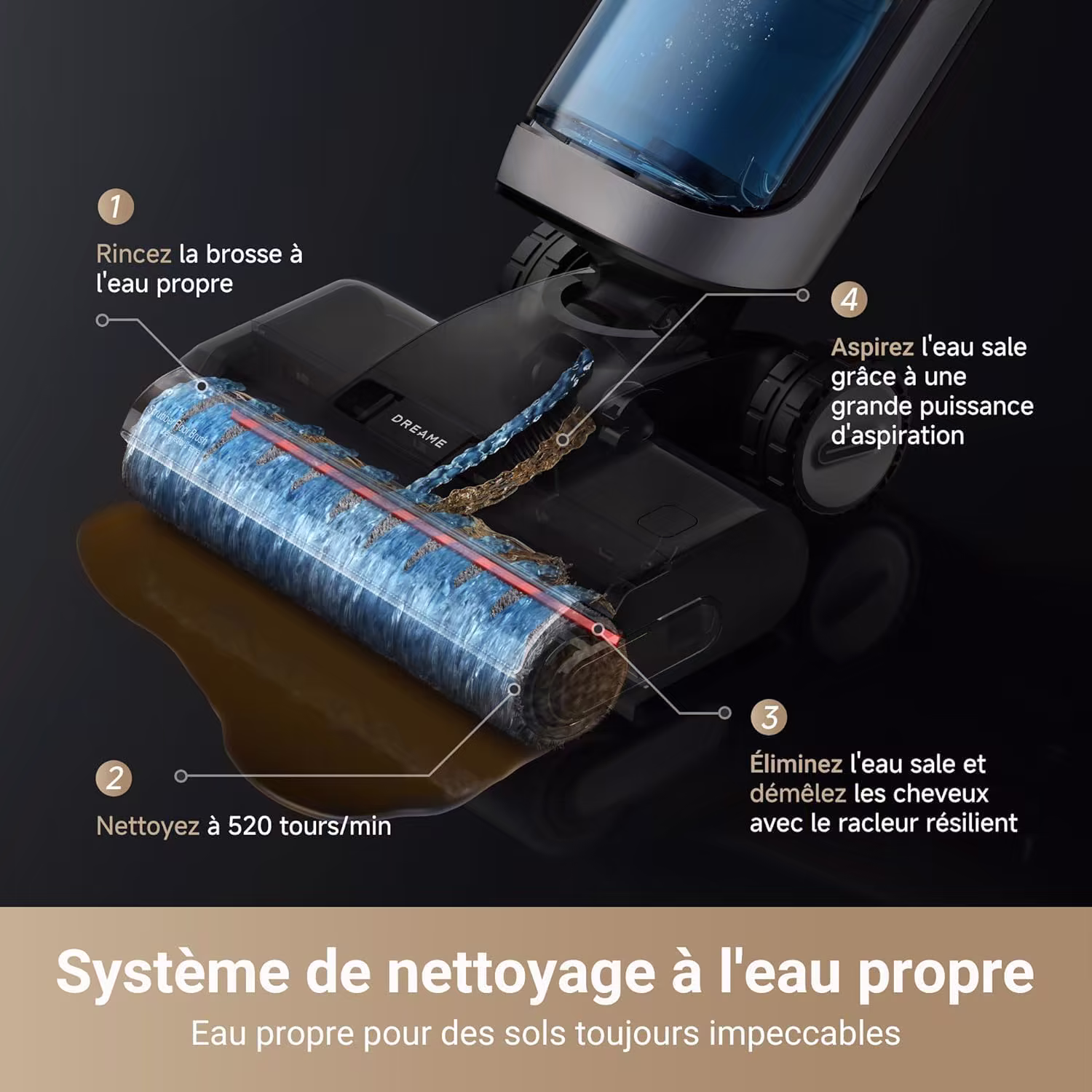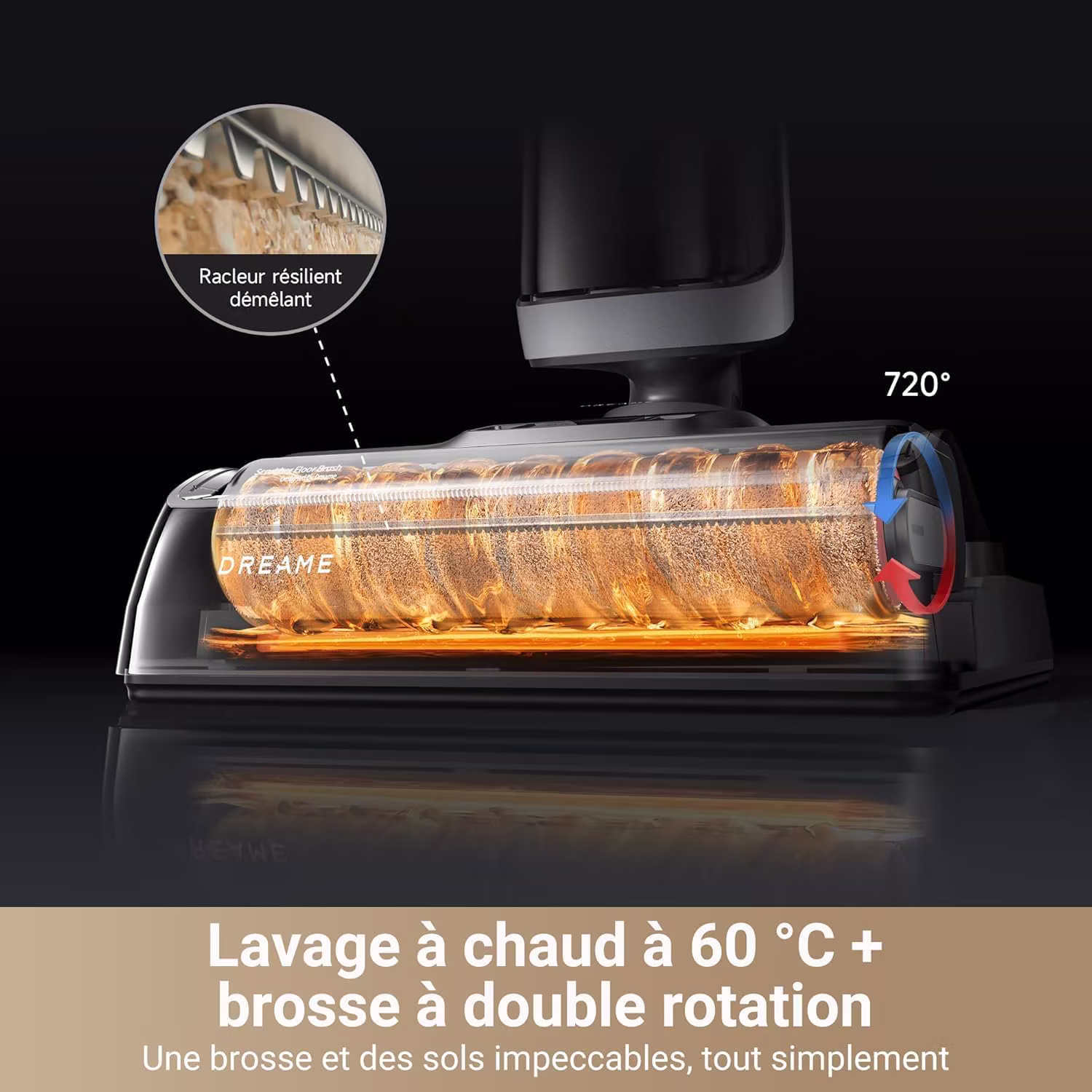 → Réservoir d'eau sale de 720 ml — le plus grand de la gamme pour réduire les vidanges