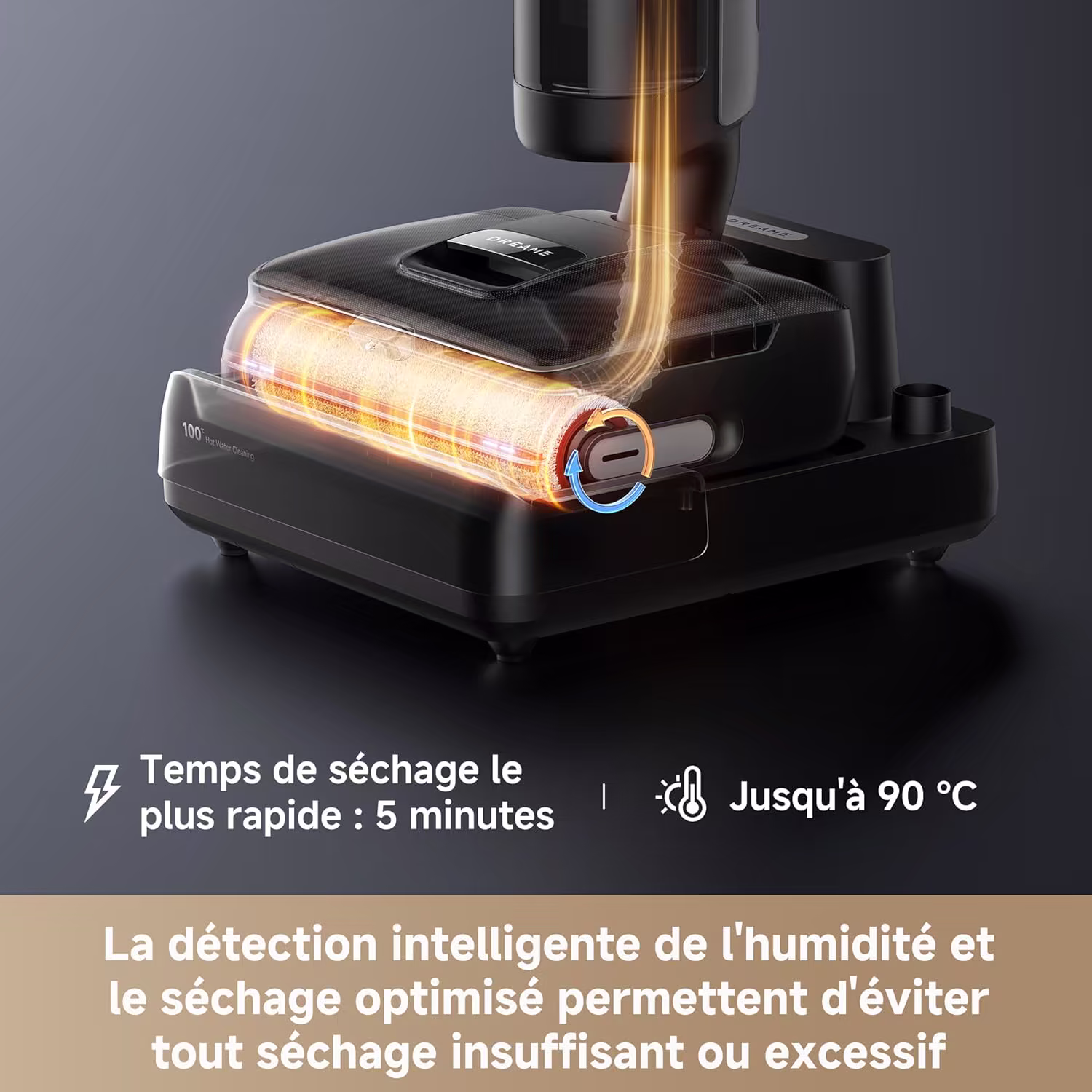Apres chaque session, le systeme ThermoTub chauffe l'eau a 100 degres C pour un auto-nettoyage en profondeur du rouleau. Le sechage a 90 degres C garantit un rouleau sec et sans odeurs. La batterie de 4 500 mAh offre 60 minutes d'autonomie, largement suffisantes pour couvrir un etage complet. L'application DreameHome permet de personnaliser les reglages et de suivre l'etat de l'appareil depuis un smartphone.