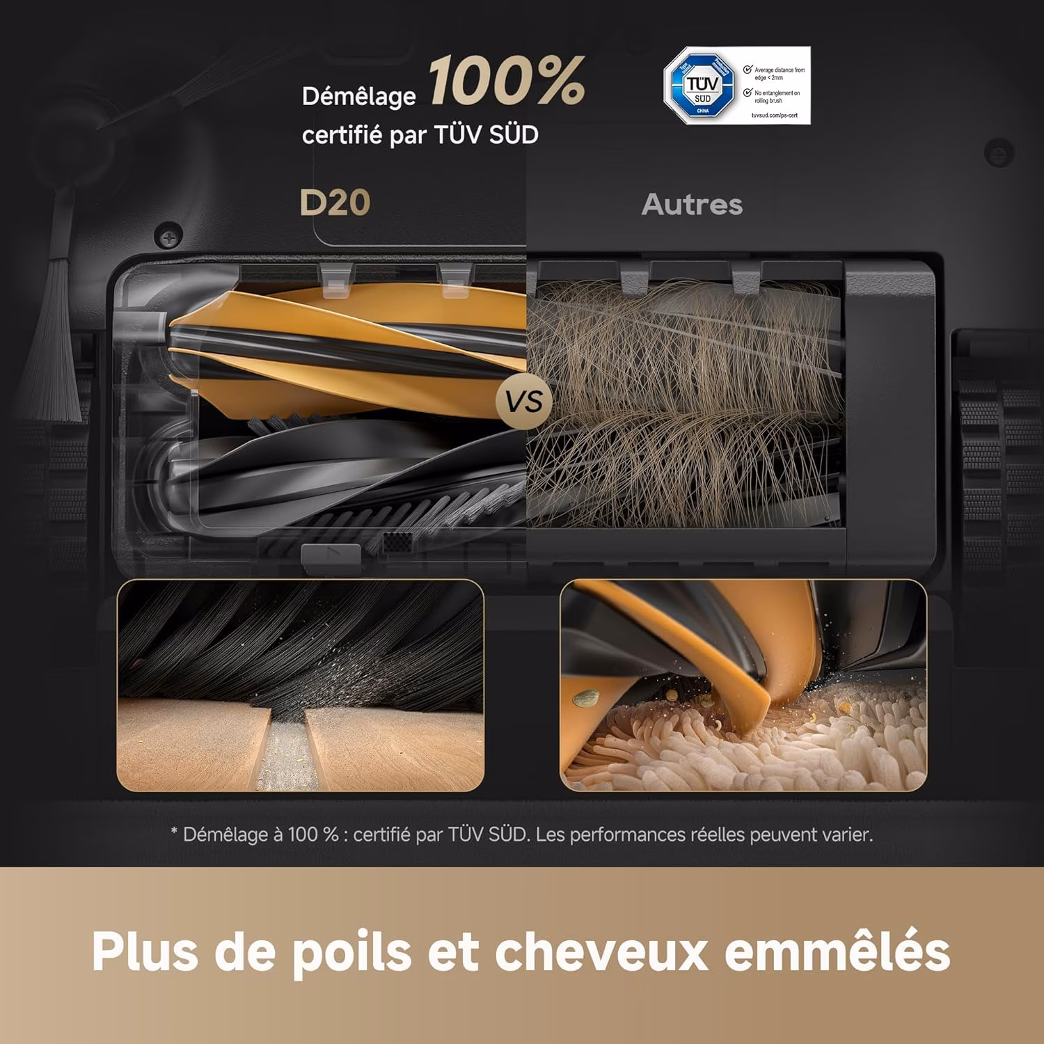 Le D20 propose une autonomie exceptionnelle de 285 minutes et un bac XL de 700 ml, ideal pour les grandes surfaces sans necessiter de station d'auto-vidage.