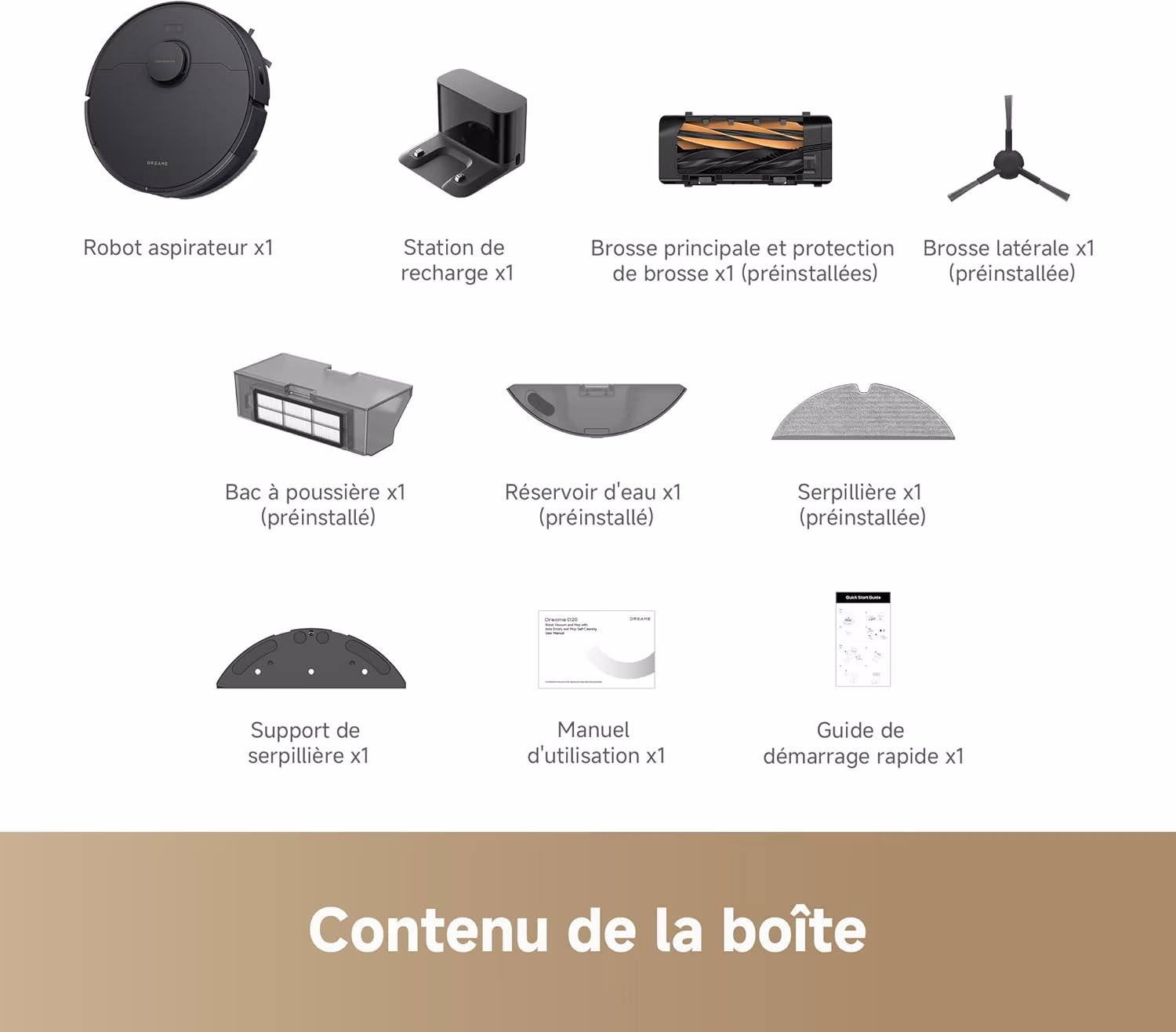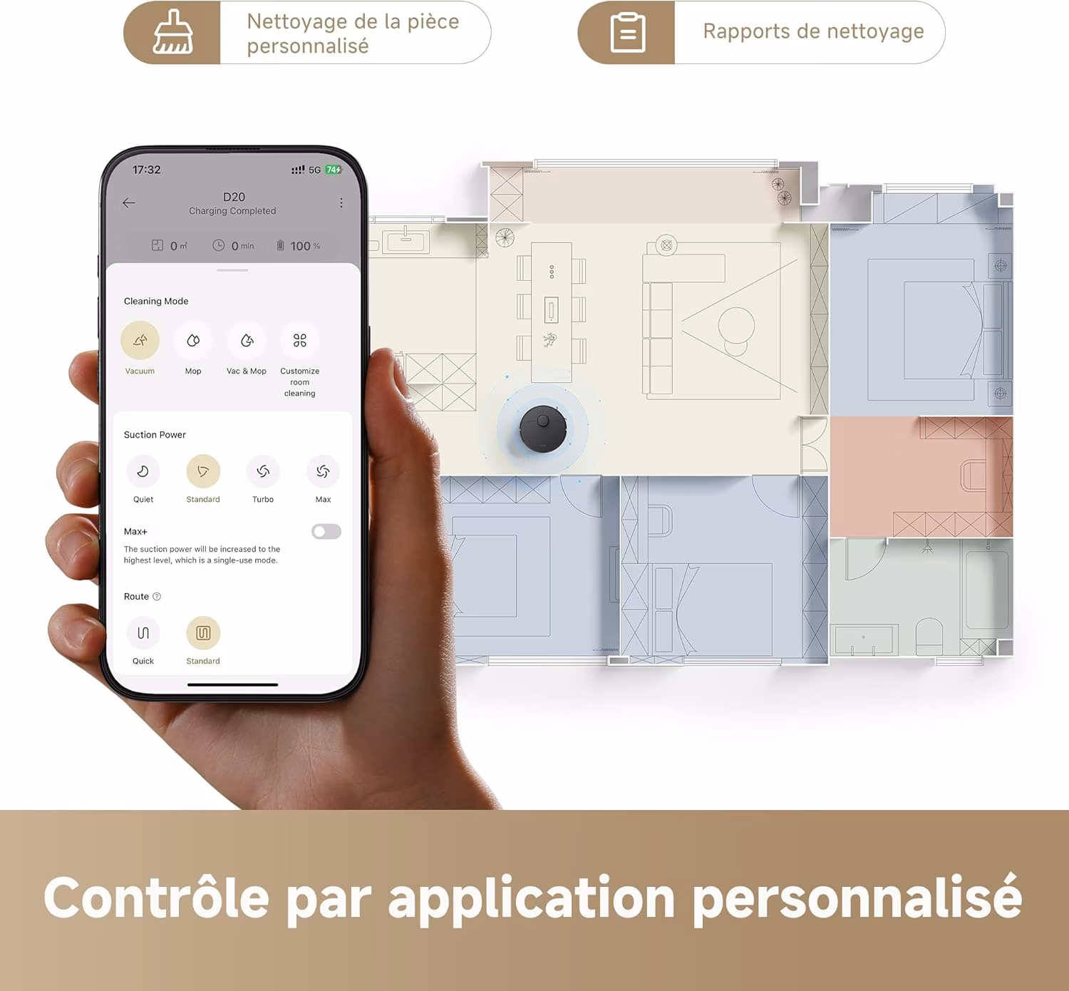 Navigation LiDAR et cartographie multi-etages Le D20 cartographie chaque etage grace a un capteur LiDAR rotatif qui genere un plan precis de l'ensemble de l'habitation. La gestion multi-etages memorise jusqu'a 4 niveaux differents, un atout pour les maisons en hauteur. Les zones interdites et les murs virtuels se configurent depuis l'application Dreamehome pour proteger les tapis fragiles ou isoler certaines pieces.