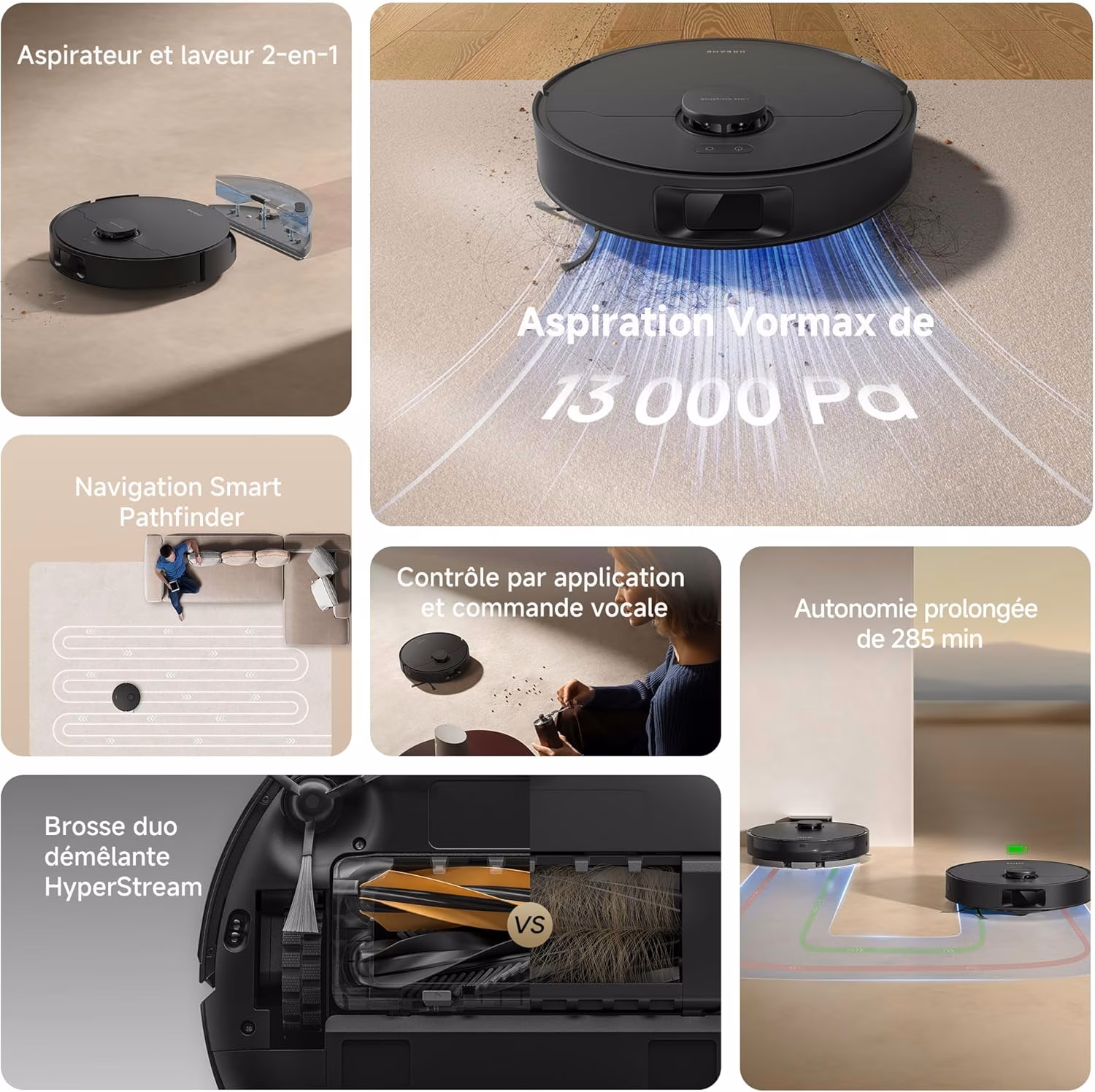 Le Dreame D20 embarque le moteur Vormax a 13 000 Pa dans un format epure, sans station d'auto-vidage. Sa brosse HyperStream double helice demele poils d'animaux et cheveux longs sans bloquer le rouleau, tandis que la serpilliere arriere lave les carrelages et sols stratifies en un seul passage. Avec 260 minutes d'autonomie et une navigation LiDAR precise, le D20 couvre aisement les niveaux multiples des habitations mitoyennes. Son profil bas de 9,7 cm lui permet de se glisser sous les buffets et canapes des salons a plafond haut que l'on retrouve dans les interieurs belges anciens.
