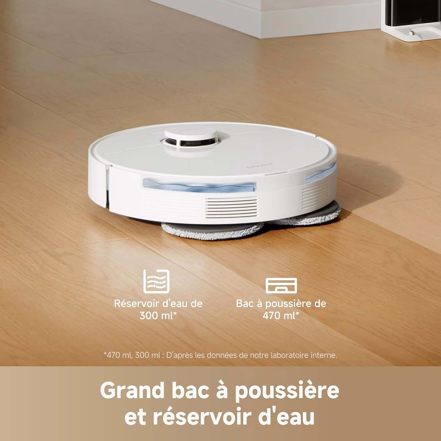 La station d'accueil lave les serpillieres a l'eau chaude puis les seche a l'air chaud apres chaque session. Le capteur LiDAR cartographie chaque etage avec precision, et la memoire multi-niveaux enregistre jusqu'a 4 plans distincts. L'autonomie de 190 minutes couvre amplement les surfaces des maisons de ville, et l'evitement d'obstacles protege le mobilier au fil des passages.