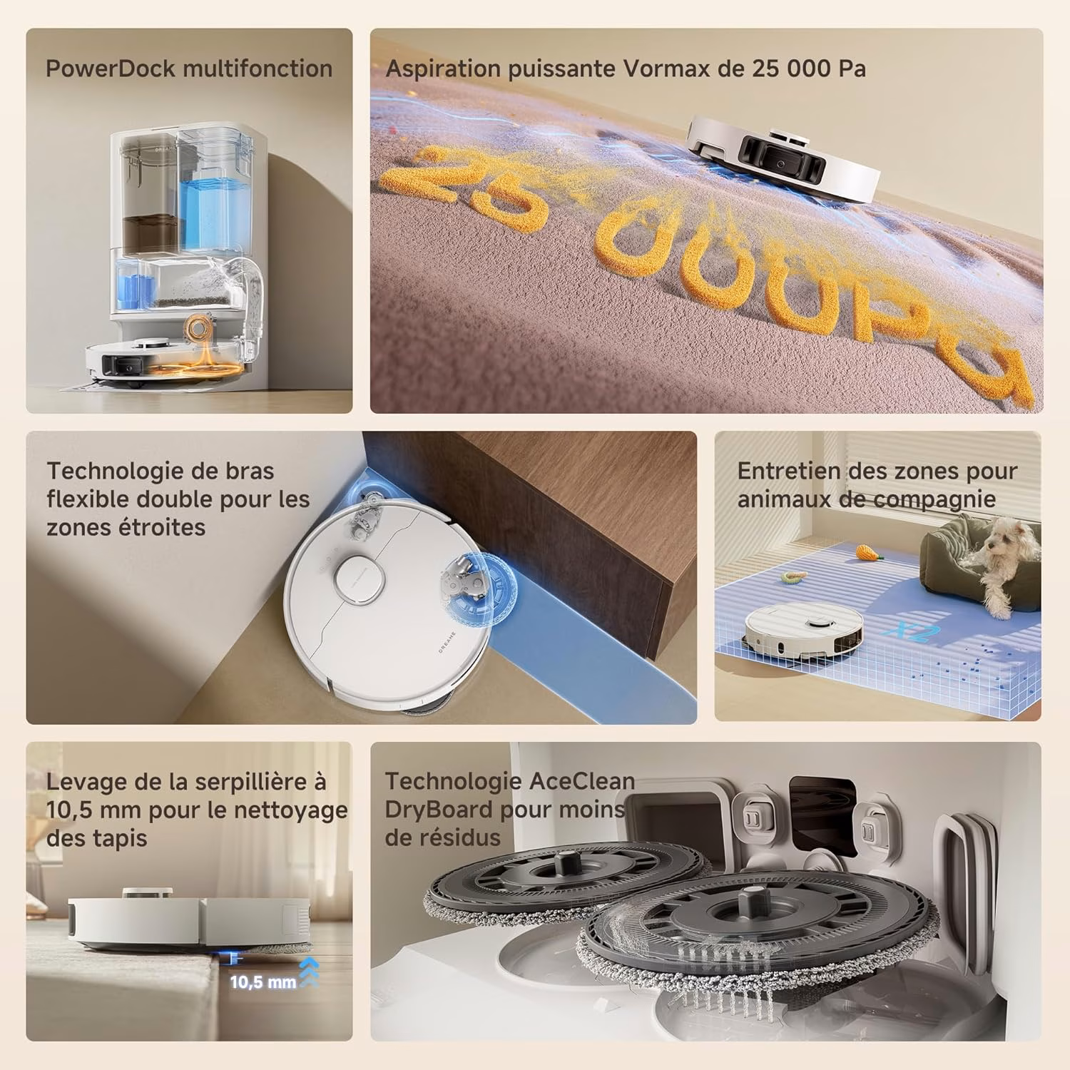 Le L10s Ultra Gen 3 établit un nouveau standard dans sa gamme avec 25 000 Pa d'aspiration, la brosse latérale extensible rétractable et la charge rapide 30%. Un excellent rapport performances-prix avec des fonctionnalités innovantes.