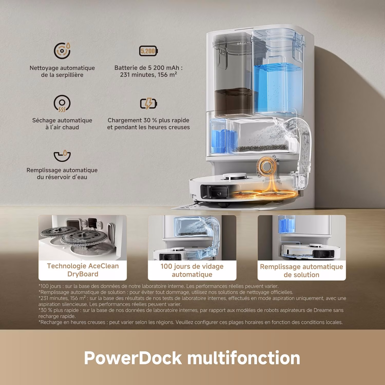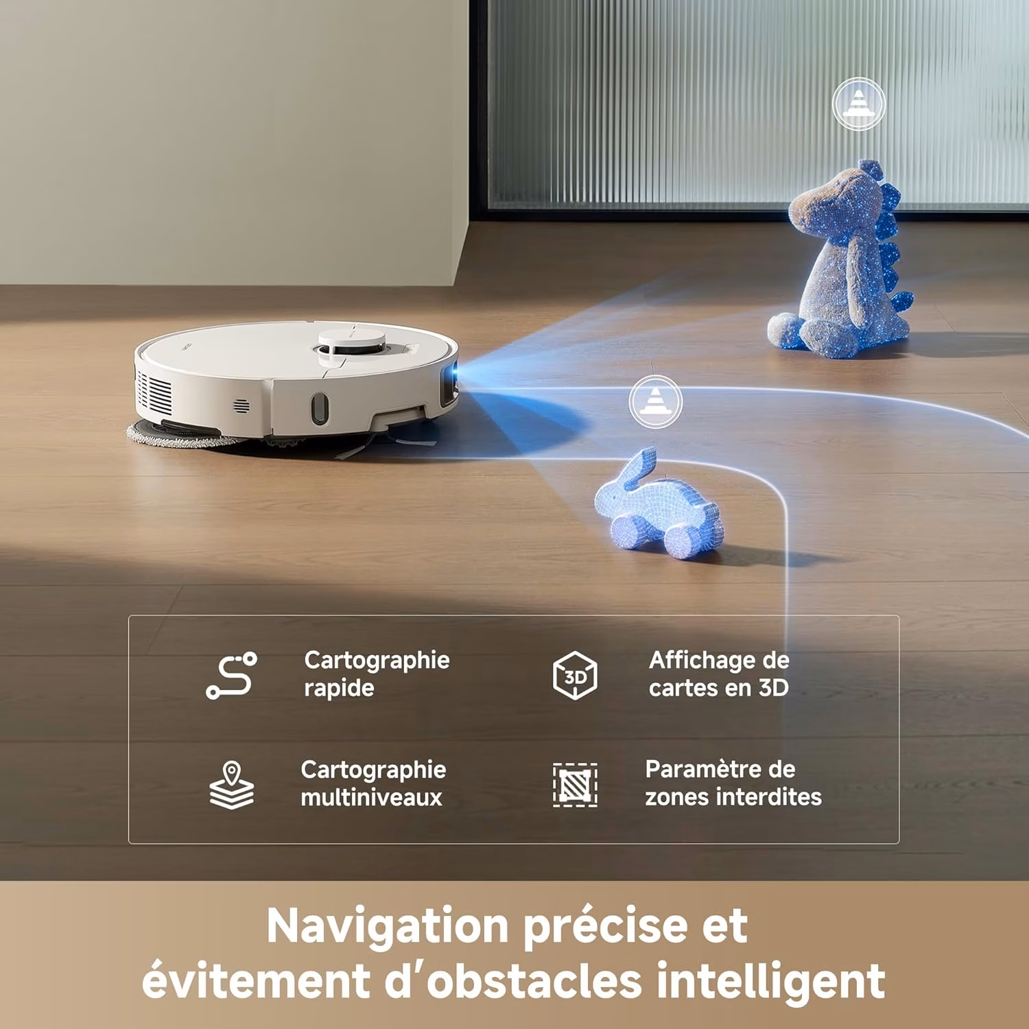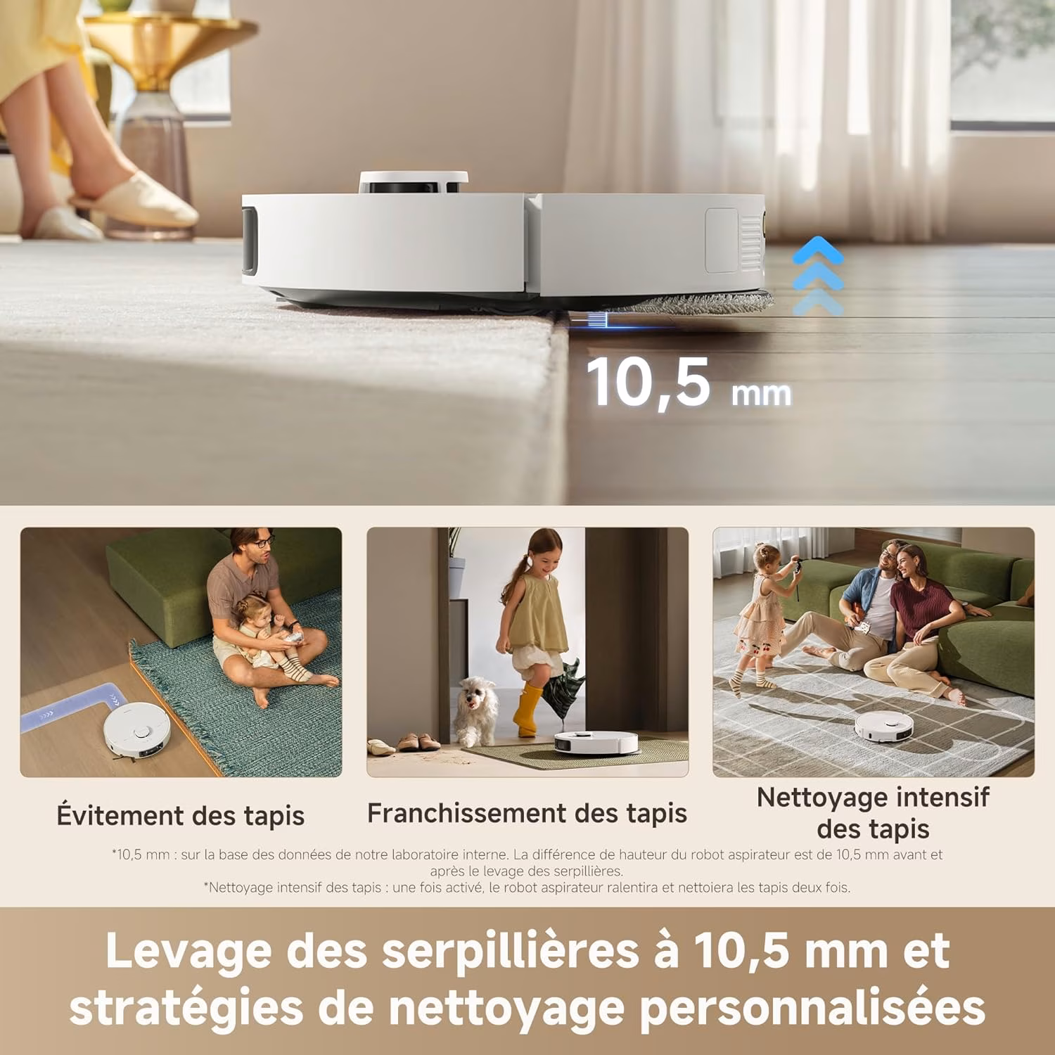 Les serpillieres extensibles MopExtend depassent le chassis du robot pour aller nettoyer le long des murs et sous les meubles bas. La station lave les pads a l'eau chaude a 70 degres C puis les seche a l'air chaud, un cycle d'hygiene complet qui elimine les bacteries. La detection de tapis souleve automatiquement les serpillieres de 10 mm a l'approche des moquettes.