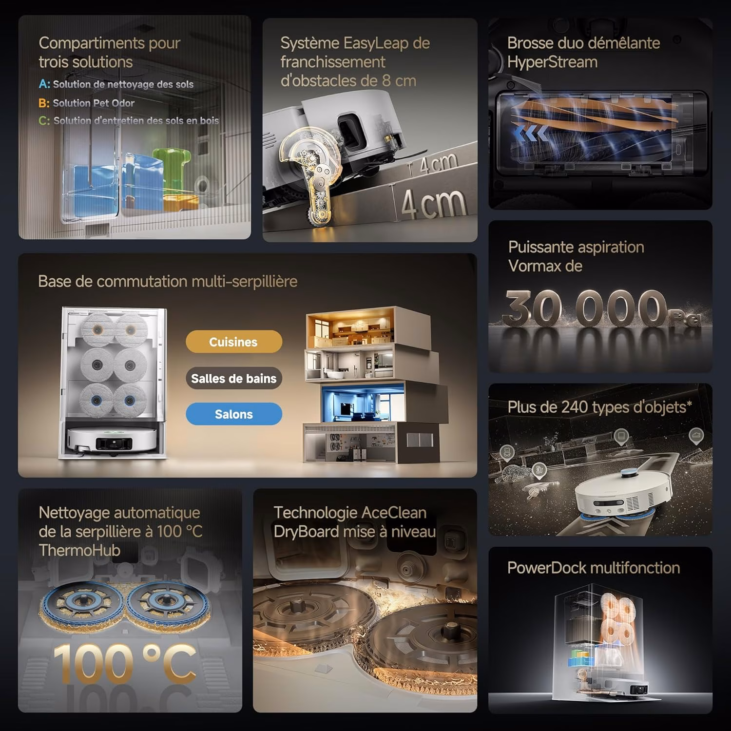 Le Matrix10 Ultra revolutionne avec 30 000 Pa d'aspiration record, un franchissement de 80 mm et un systeme multi-serpillieres unique pour adapter le nettoyage a chaque sol.