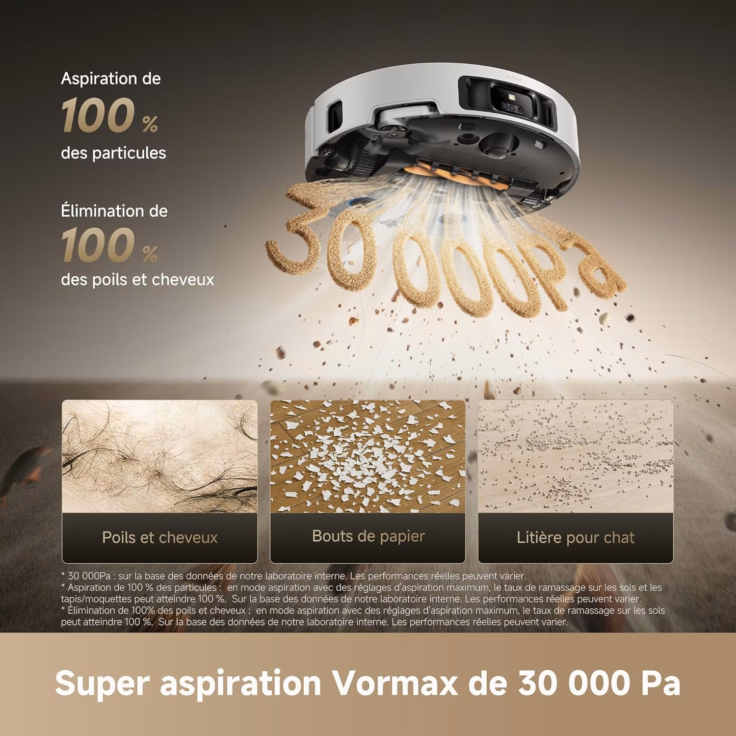 → Aspiration de 30 000 Pa — la plus puissante du marche, superieure au X50 Ultra Complete (20 000 Pa) et au L40s Pro Ultra (18 000 Pa)