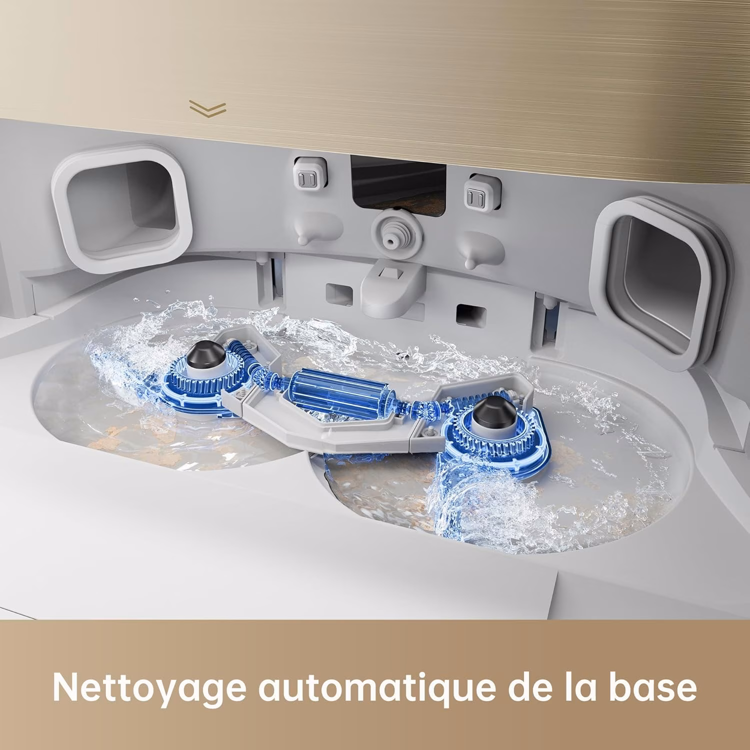 → Brosse latérale extensible de 10 mm et relevable de 10 mm — atteint les coins difficiles, absente sur les modèles d'entrée de gamme