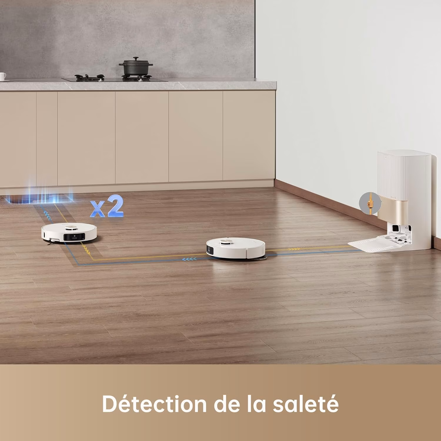 Les serpillieres se clipsent et se declipsent automatiquement a la station de base. Lorsqu'un tapis est detecte, le robot revient a la station, depose ses serpillieres et repart aspirer le tapis a pleine puissance. La station 7-en-1 lave a l'eau chaude, seche a l'air chaud, vide le bac a poussiere et recharge l'eau et la solution nettoyante. Une autonomie de gestion qui convient aux proprietaires actifs.