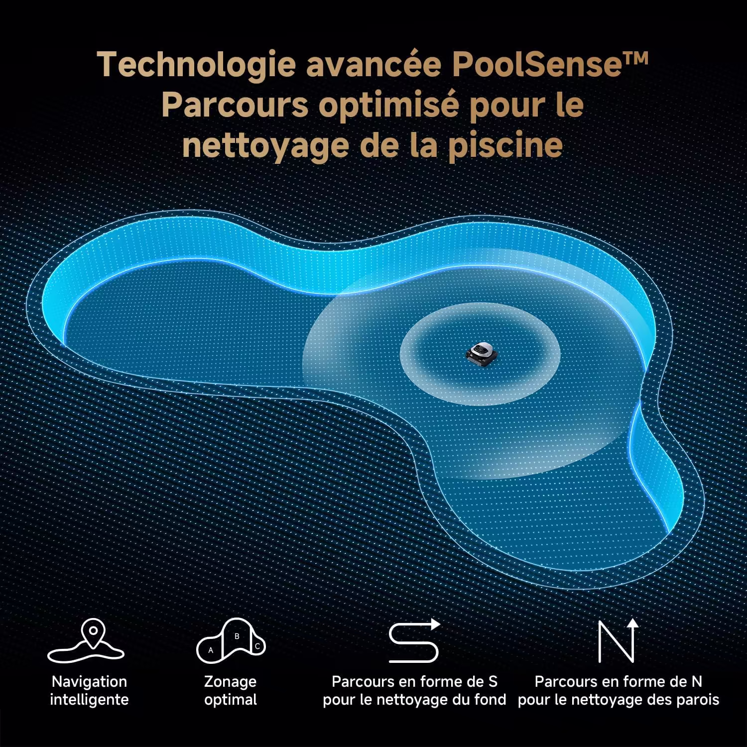Cartographie 3D PoolSense Le PoolSense genere une carte tridimensionnelle de la piscine — enterree ou hors sol — jusqu'a 15 metres de longueur. Le robot optimise ses trajectoires pour couvrir chaque surface sans repasser au meme endroit. Le parking intelligent le ramene automatiquement au bord pour un retrait facile.