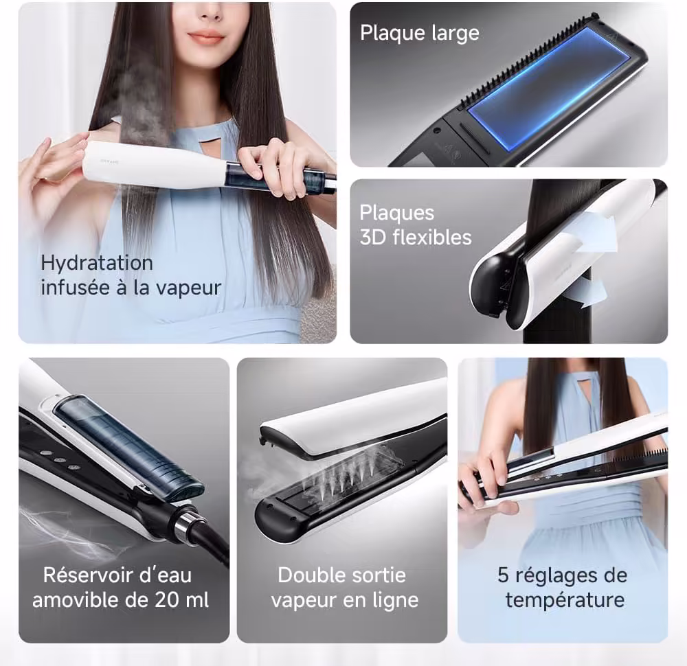 Le Dreame AuraSteam Straight revolutionne le lissage avec son systeme Hydra-Mist a vapeur. Plaques 3D ultra-larges et infusion d'humidite : il lisse sans assecher, pour des cheveux proteges et brillants.