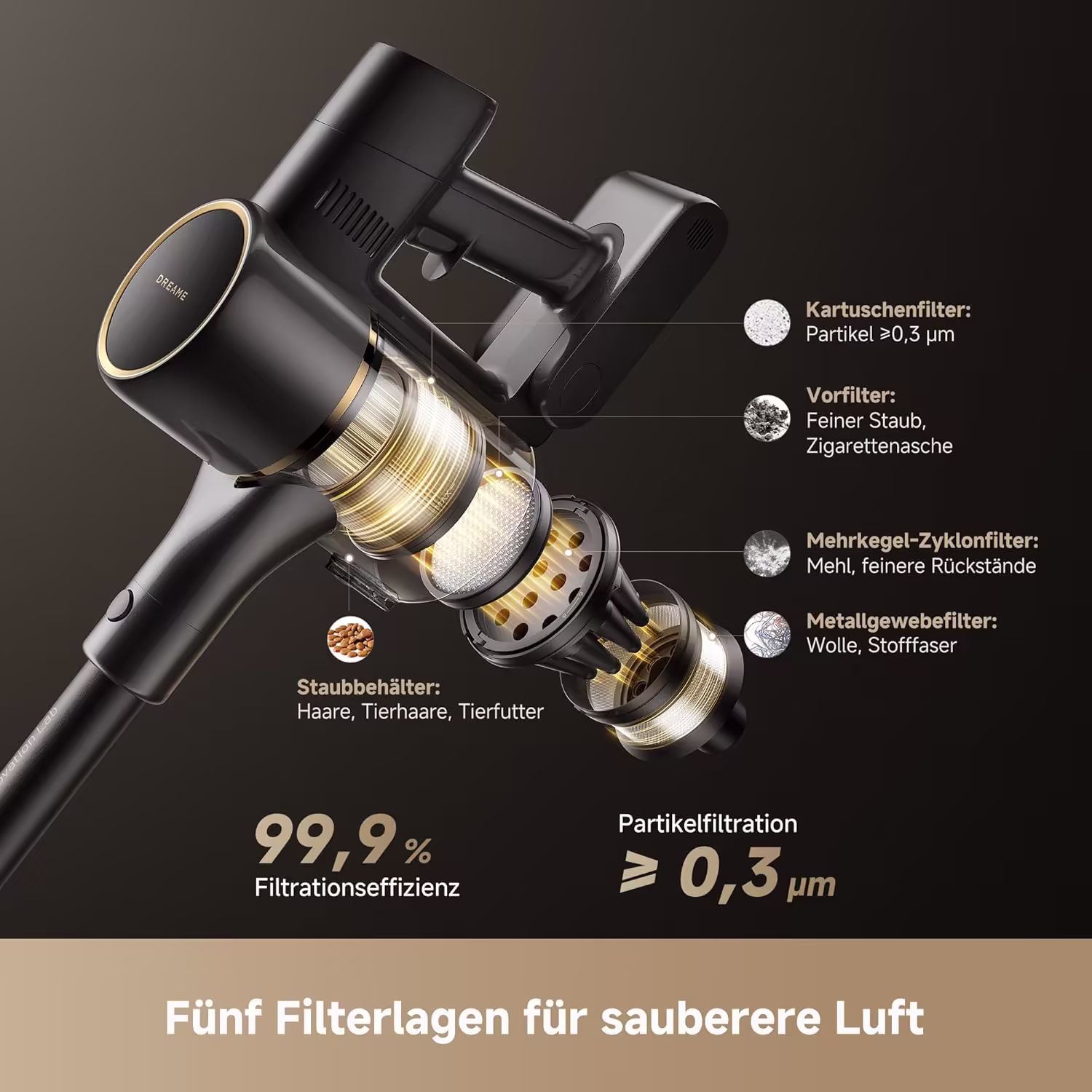 Das 5-Schicht-Filtersystem des R20 SE-A faengt 99,9 % aller Partikel ab 0,3 Mikrometer auf, einschliesslich Allergene, Milben und Feinstaub. Die Anti-Tangle V-Buerste mit dem CelesTect-Weitwinkel-Lichtsystem macht unsichtbaren Staub sichtbar. Der 0,6 L Staubbehaelter laesst sich mit einem Tastendruck kontaktfrei entleeren – fuer maximale Hygiene.