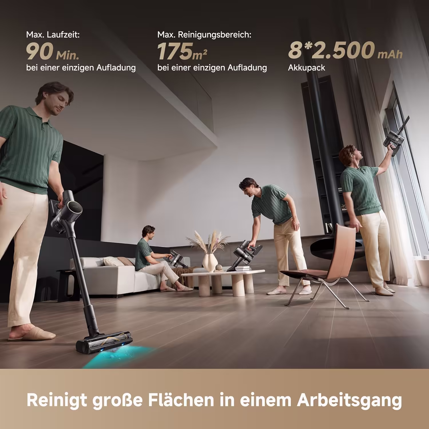 → Der 3.000-mAh-Akku bietet 90 Minuten im Eco-Modus, ideal für große Häuser