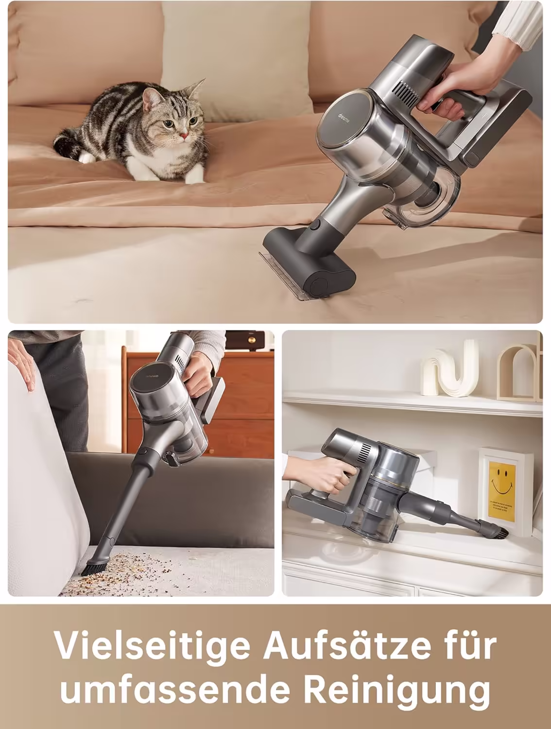 Der Dreame R20 setzt neue Massstaebe bei kabellosen Stielstaubsaugern mit einer Saugleistung von 180 AW und einem Farb-LCD-Display, das in Echtzeit den Modus, den Akkustand und Wartungshinweise anzeigt. Mit 1,75 kg bleibt er leicht und handlich und liefert gleichzeitig ueberlegene Leistung fuer anspruchsvolle Reinigungsaufgaben. Das integrierte flexible Saugrohr erreicht auch schwer zugaengliche Bereiche wie unter niedrigen Moebeln oder hinter Sofas.