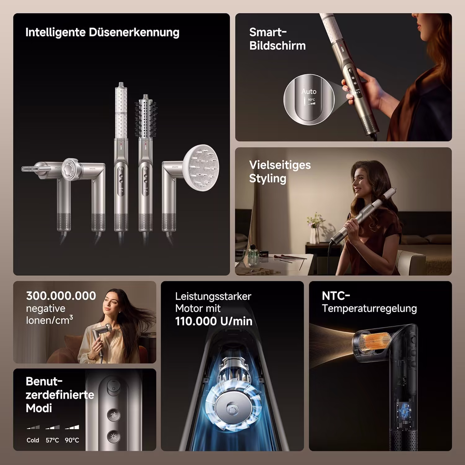 Der 110.000 RPM Motor ist wirklich kraftvoll. Meine Tochter trocknet ihre langen Haare jetzt in unter 5 Minuten statt 15. Die magnetischen Aufsatze rasten satt ein. Der NTC-Sensor mit 300 Temperaturmessungen pro Sekunde gibt Sicherheit. Das Display ist ein nettes Extra. Einziger Nachteil: Das Gerat ist etwas grosser als herkommliche Fohne. Trotzdem ein Premium-Produkt.