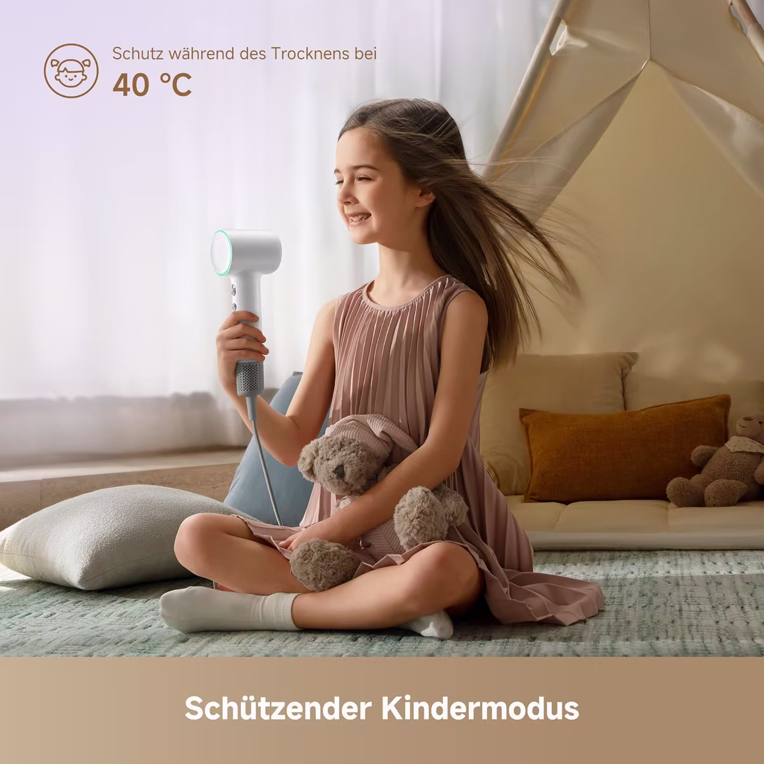 Wir haben den Dreame Mini hauptsaechlich wegen des Kindermodus gekauft. Unsere dreijahrige Tochter hatte immer Angst vorm Fohnen, weil herkoemmliche Gerate zu heiss waren. Mit dem Kindermodus bei 40 C ist das Problem geloest — sie lasst sich jetzt sogar gerne die Haare trocknen. Die LED-Anzeigen zeigen klar den aktiven Modus an. Die 100 Temperaturmessungen pro Sekunde merkt man: Die Warme bleibt wirklich konstant. Klare Kaufempfehlung fuer Familien.