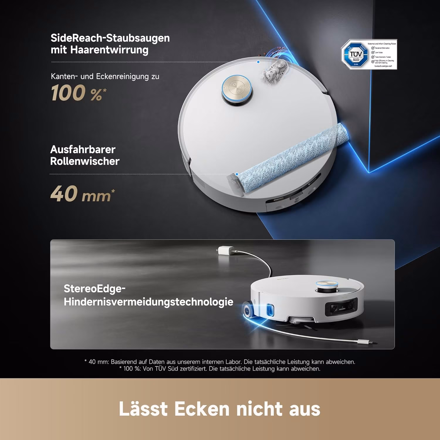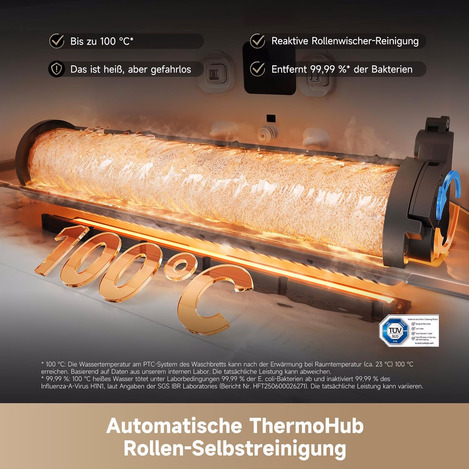 Der Dreame Aqua10 Ultra Roller Complete ist der erste Saugroboter mit einer gegenläufig rotierenden FluffRoll™-Walze. Schluss mit klassischen Rotationsmopps — die Walze tragt kontinuierlich frisches Wasser auf, wahrend sie Schmutz abschabt, wie ein professioneller Nassreiniger. Mit 30.000 Pa, FlexRise™-Luftfederung und 80 mm Kletterhöhe setzt er neue Massstabe bei der Tiefenreinigung.