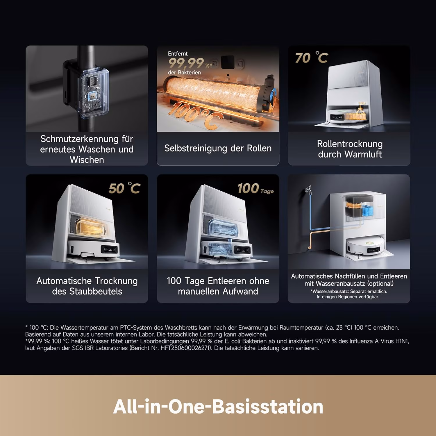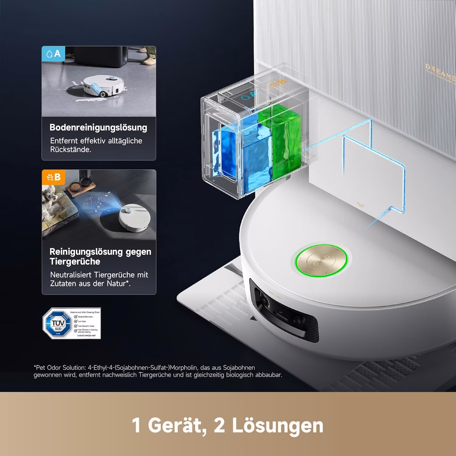 PowerDock™ — All-in-One-Station bei 100°C Die PowerDock™-Station wascht die Walze bei 100°C, trocknet mit Heissluft, entleert den Staubbehalter 100 Tage lang automatisch und fullt Wasser sowie Reinigungslosung nach. Das Doppel-Losungsfach trennt Wasser und Reinigungsmittel. Integrierte Sprachsteuerung « OK Dreame ».