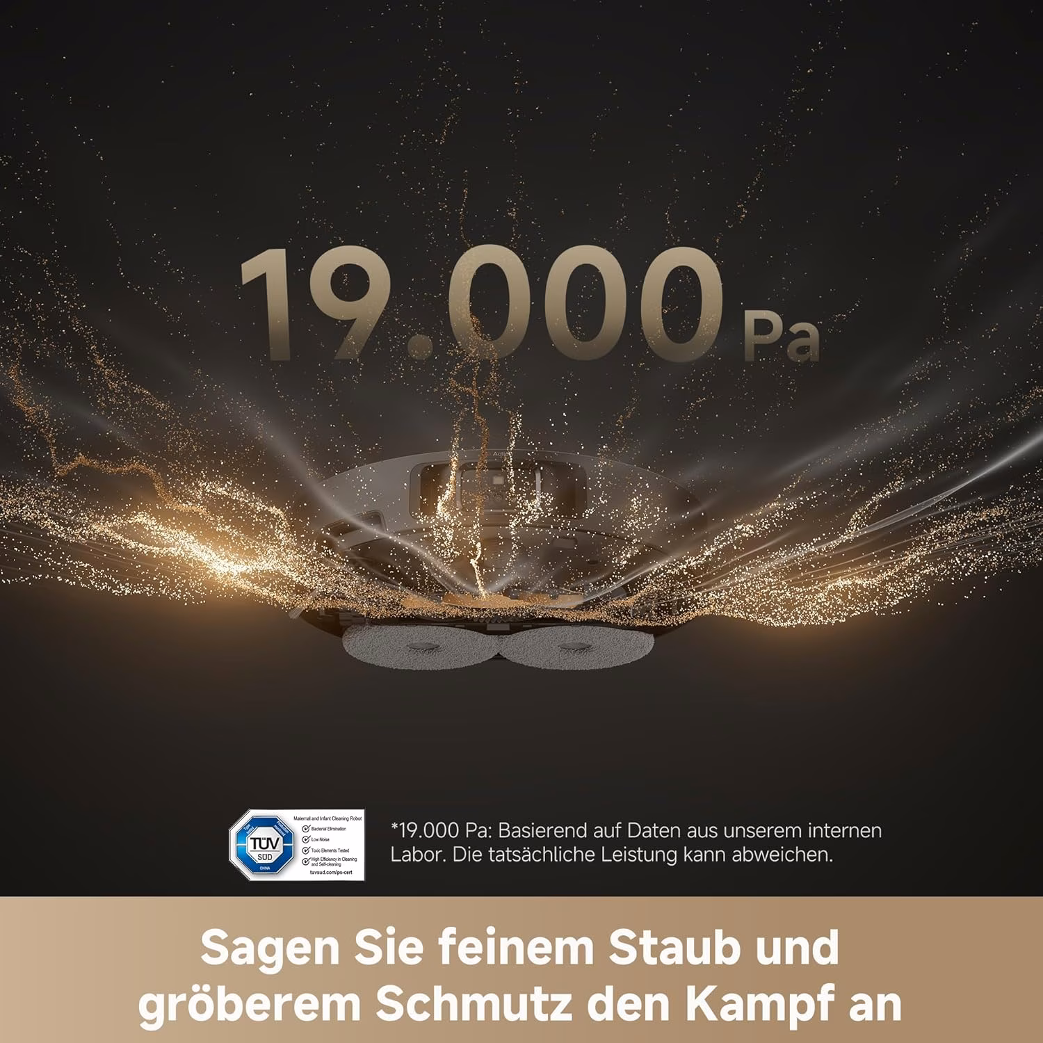 → 15.000 Pa Saugkraft — höher als X40 (12.000 Pa) und L10s Ultra Gen 2 (10.000 Pa), aber niedriger als L50 Pro Ultra (19.500 Pa) und X50 (20.000 Pa)