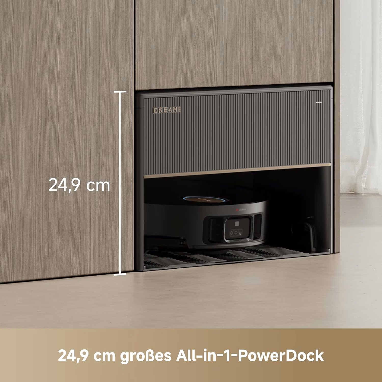 PowerDock 8-in-1 UV — Kompakte Basis, maximale Funktionen Die PowerDock 8-in-1 Station ist mit nur 24,9 cm Breite die kompakteste Dockingstation auf dem Markt fur diesen Funktionsumfang. Sie bietet 100-Tage-Auto-Entleerung, 176°F Heisswasser-Moppwasche, Heisslufttrocknung, UV-Sterilisation, automatische Wasserbefallung und automatische Reinigungsmittel-Dosierung. Funf Teppichmodi passen die Saugleistung an jede Textiloberflache an.