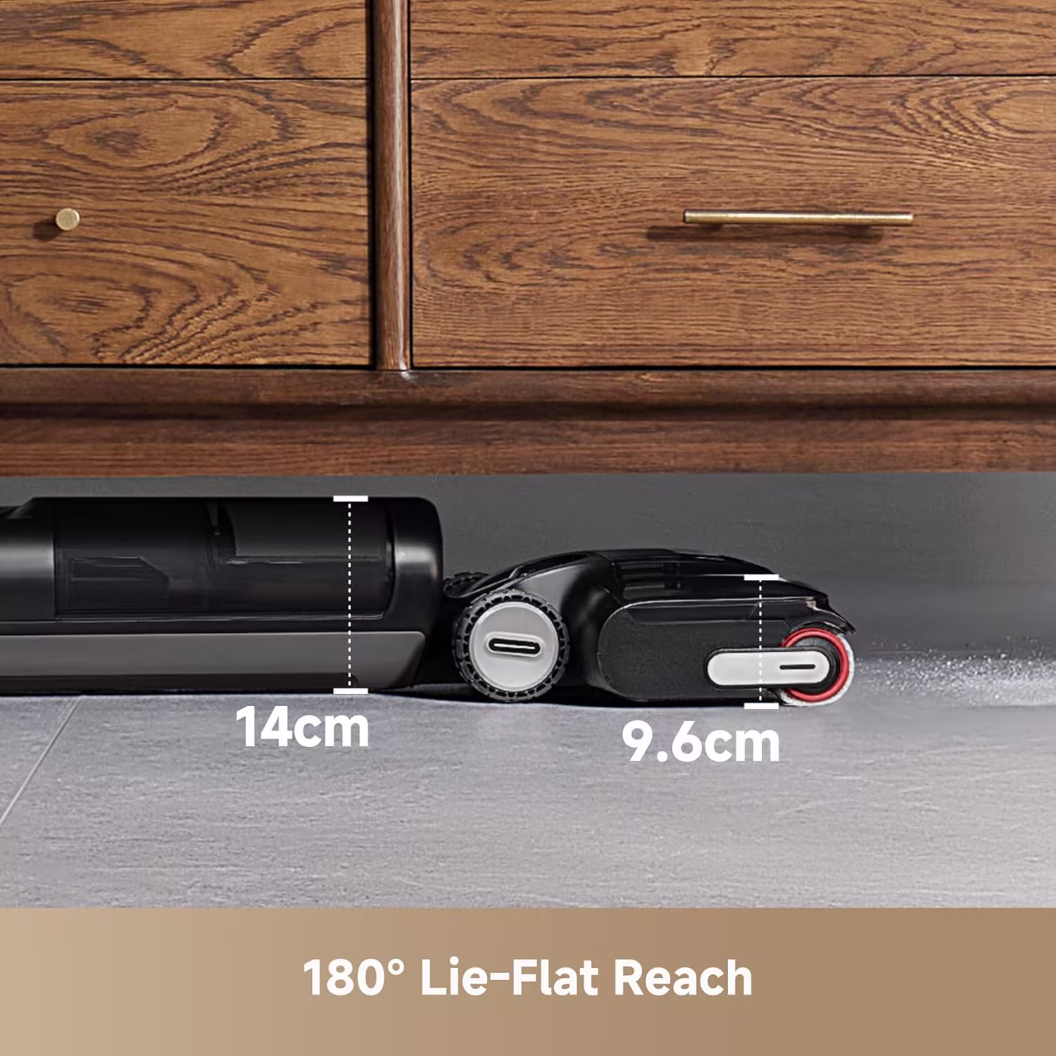 → 180-degree flat reach with constant suction — the 18,000 Pa power doesn't decrease even when laid flat under furniture