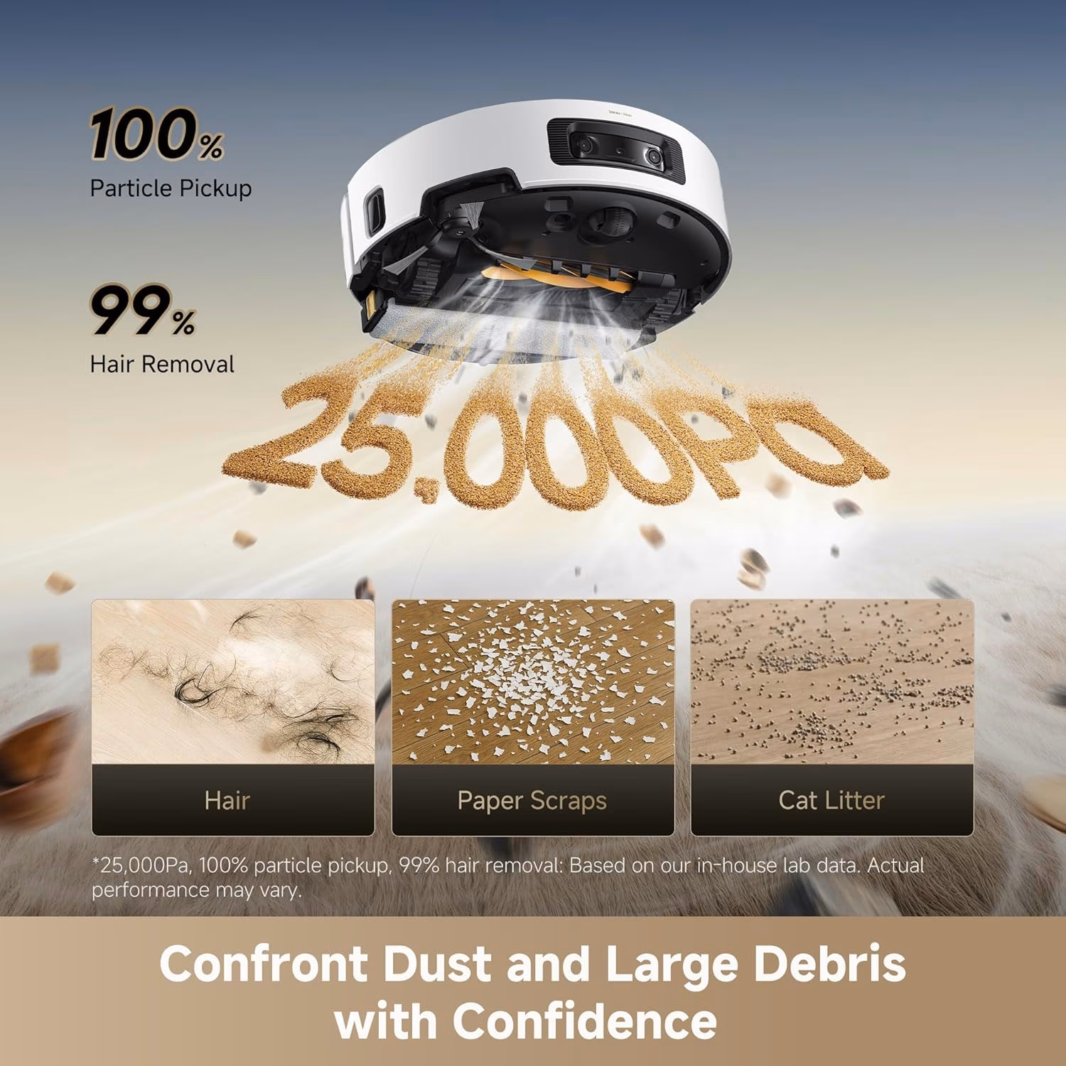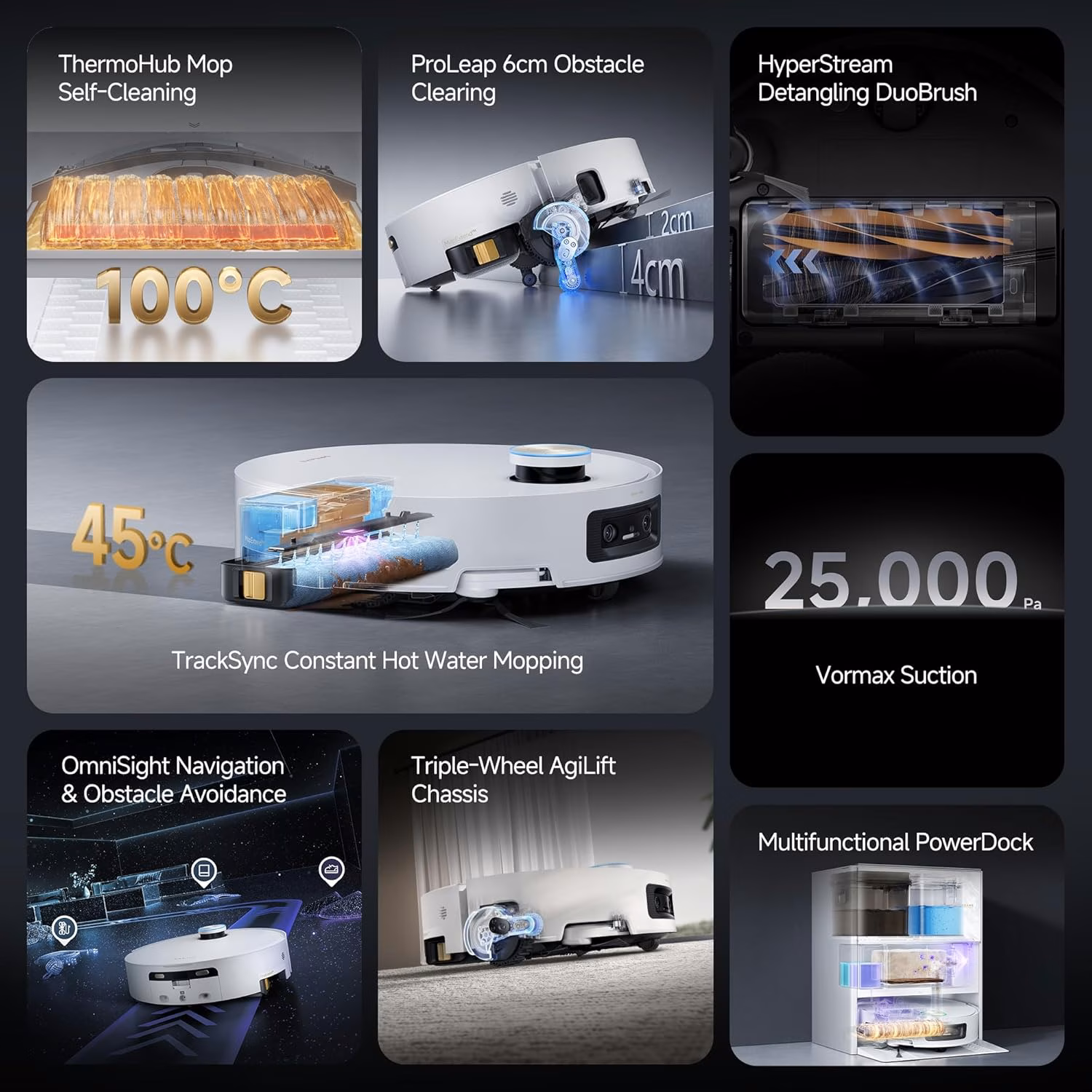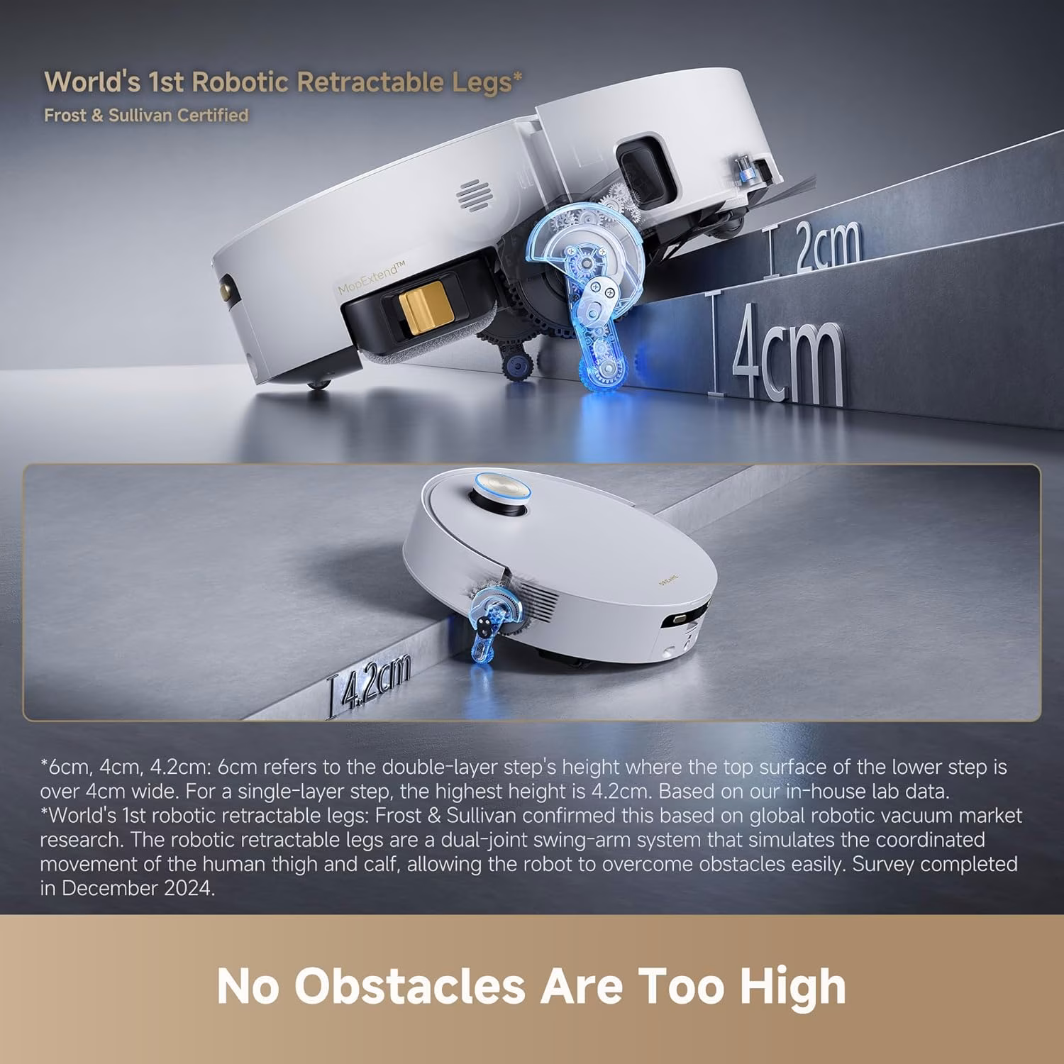 HyperStream dual-material brush and EasyLeap The HyperStream brush combines rubber and TPU for 25,000 Pa suction without tangling. Retractable robotic feet allow the robot to cross obstacles up to 60 mm, while the EasyLeap system handles door thresholds up to 40 mm with remarkable ease. The mop detaches or lifts automatically when approaching carpets.