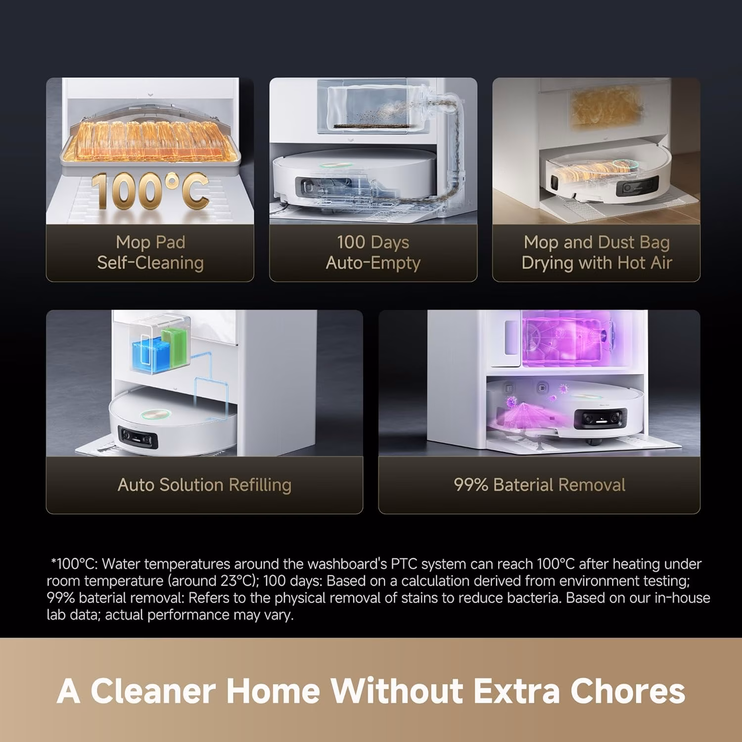 PowerDock 100°C — Auto-emptying and automatic refill The PowerDock station washes the track at 100°C for total disinfection, dries with hot air and auto-empties the dustbin for 100 days. It also refills water and cleaning solution automatically. Zero intervention for weeks on end.