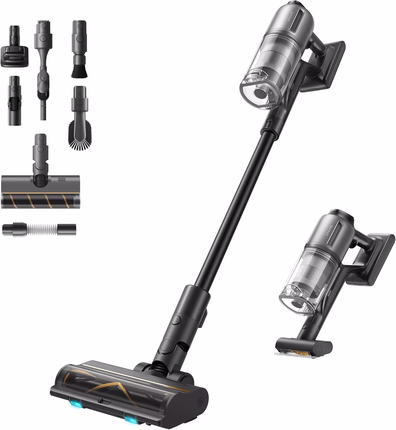 Its 2,500 mAh battery provides up to 60 minutes of runtime in standard mode, more than enough to clean a flat or small house. The V-shaped anti-tangle brush prevents hair from wrapping around the roller, reducing maintenance hassle. The included wall mount frees up floor space and keeps the vacuum always within reach, ready for action.