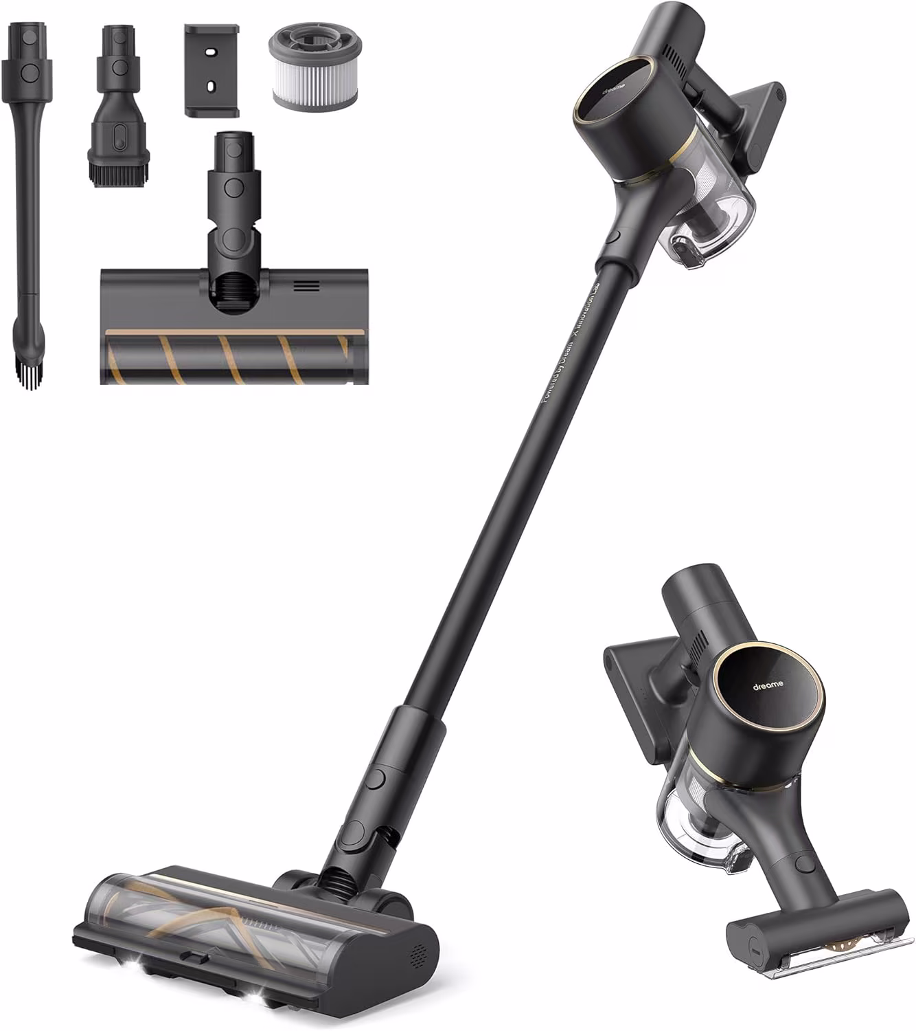 With 90 minutes of runtime and a flexible tube with 4-position length adjustment, the Dreame V30 adapts to every cleaning scenario. Its filtration captures 99.99% of particles above 0.1 µm for immaculate indoor air quality. The removable battery clicks out for rapid replacement. The auto-recharge base station sits on the floor with no wall drilling required. The V30 comes with a combined tool, a mini motorised brush and a multi-surface brush to cover all cleaning needs.