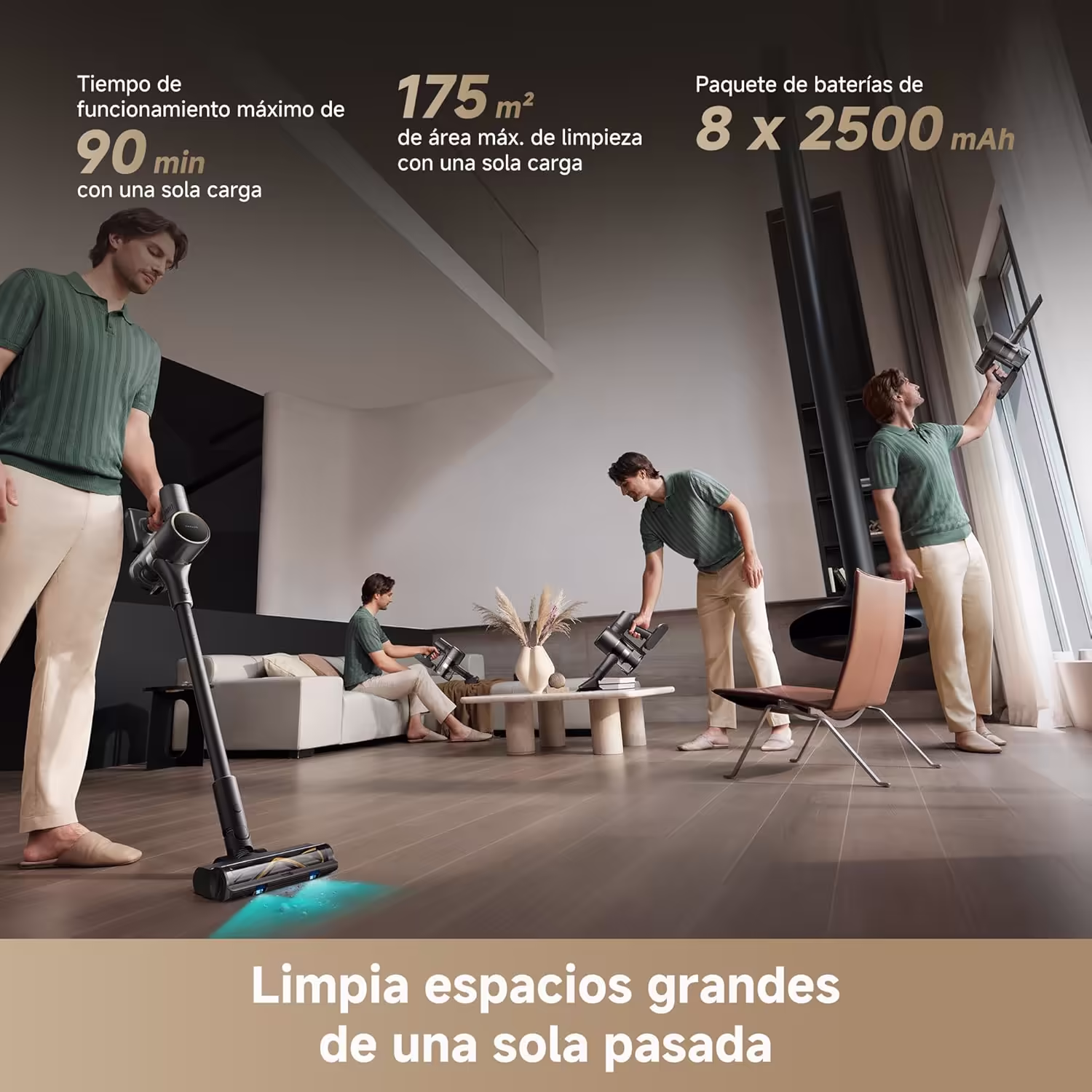 El Dreame R20 SE-A es un aspirador escoba sin cable que combina potencia y resistencia. Su motor de 150 AW (20.000 Pa) junto con un sistema avanzado de 12 ciclones garantiza una aspiracion constante sin perdida de potencia, incluso cuando el deposito se llena. Este sistema ciclonico separa eficazmente las particulas del flujo de aire, evitando cualquier obstruccion del filtro. Con 90 minutos de autonomia en modo Eco, el R20 SE-A cubre sin problemas grandes superficies, desde casas de varias plantas hasta pisos amplios.