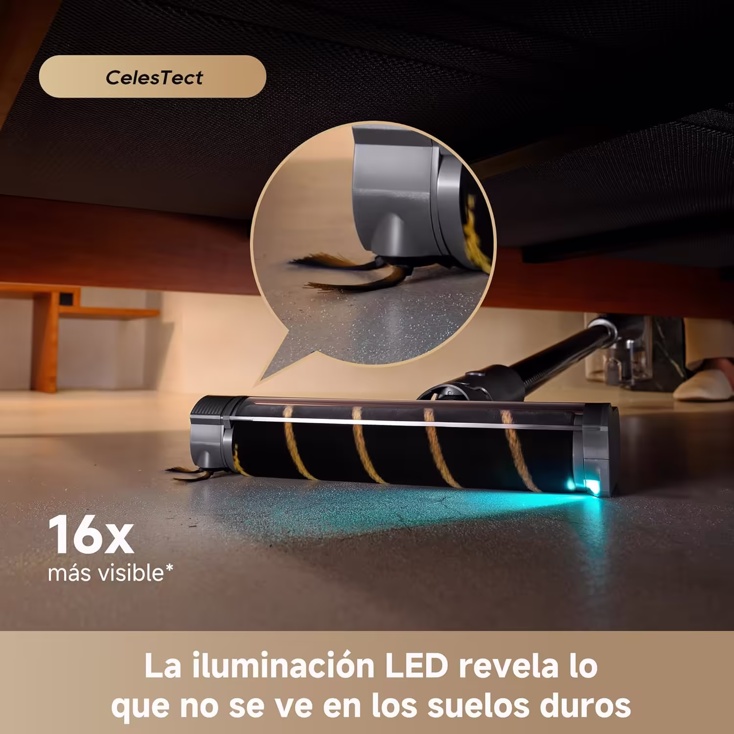 El R30 incorpora un sistema de deteccion inteligente de suciedad que ajusta automaticamente la potencia de aspiracion segun el nivel de suciedad detectado. El cepillo multisuperficie CelesTect con LED integrado ilumina las particulas invisibles a simple vista, mientras que sus cerdas en V optimizan la captura en todo tipo de suelos. El peine antienredos integrado impide que el pelo se enrolle en el rodillo, reduciendo el mantenimiento al minimo.