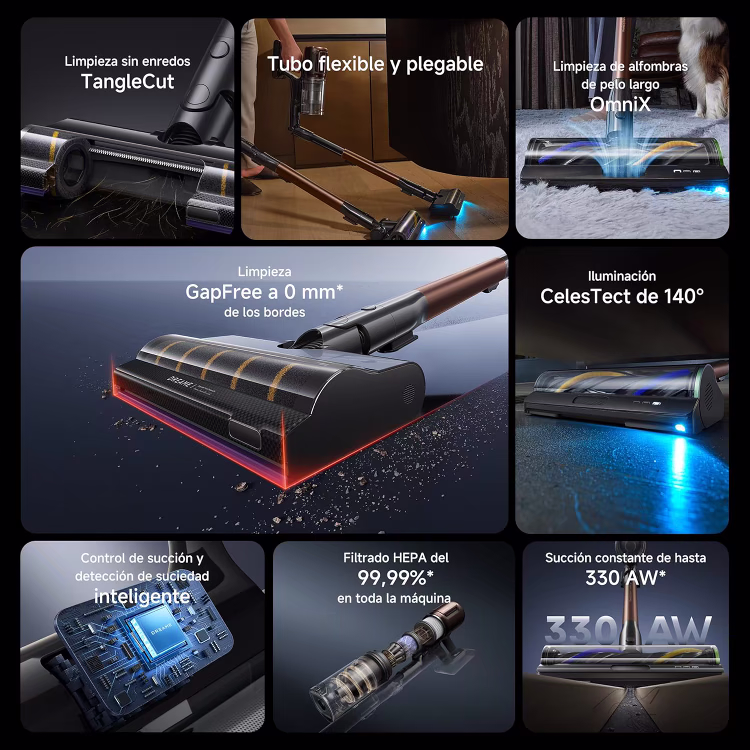 El V30 incorpora el cabezal dinamico OmniX 2.0, disenado especificamente para alfombras de pelo largo. Un sensor inteligente de tipo de suelo ajusta automaticamente la potencia de aspiracion segun la superficie detectada. El sistema motorizado Double TangleCut corta continuamente el pelo humano y de mascotas que se enrolla en el cepillo, garantizando un rendimiento constante sin mantenimiento manual. La iluminacion LED CelesTect de 140° revela el polvo invisible al ojo humano incluso en los rincones mas oscuros.