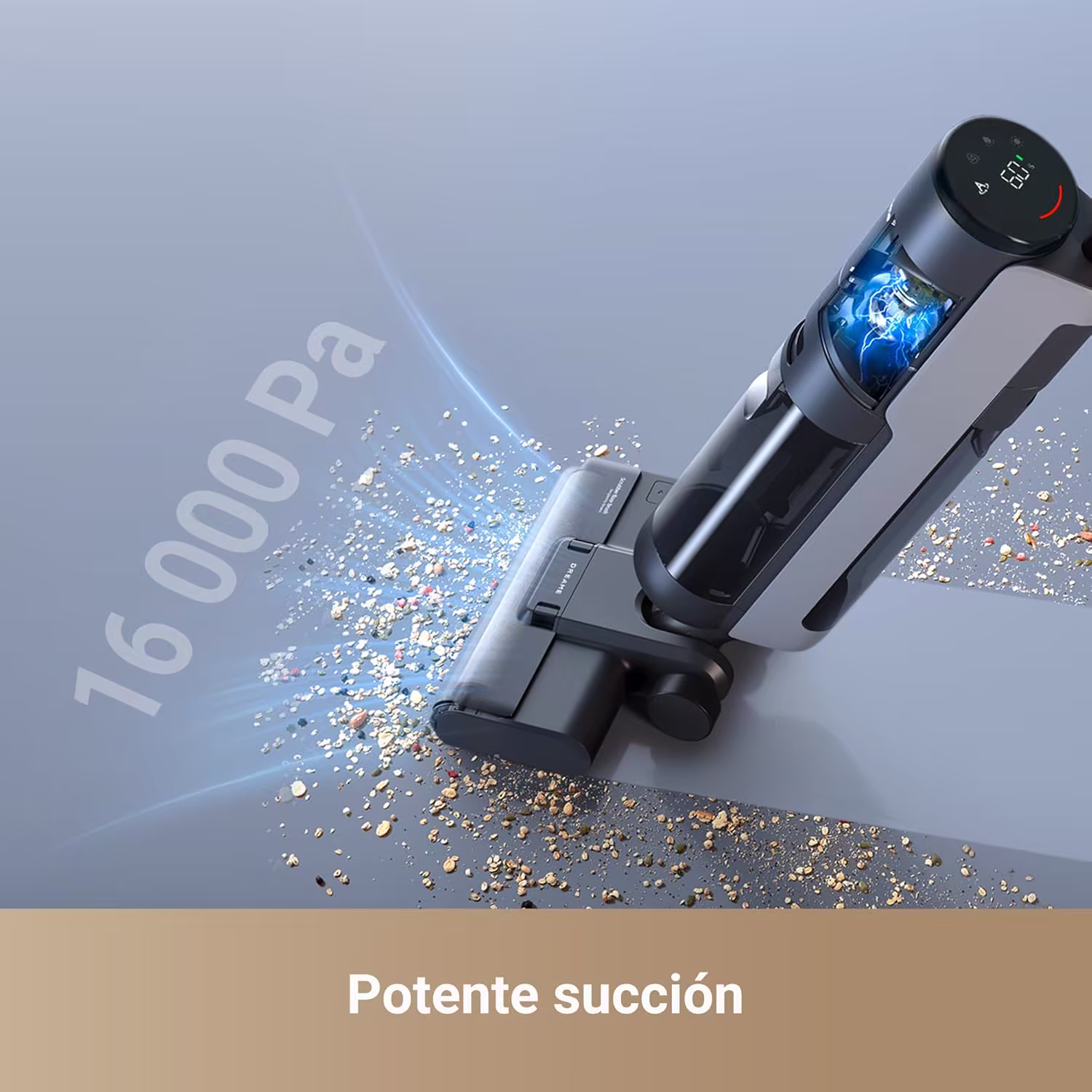 El Dreame H12S incorpora un motor que entrega 16.000 Pa de potencia de succion, un nivel de rendimiento que trata con eficacia suelos duros como baldosas, parquet y vinilo. Su cepillo de doble borde mejorado limpia a menos de 6 mm de los rodapies, capturando polvo y residuos donde la mayoria de fregadores dejan restos. El resultado son suelos impecables de pared a pared, sin necesidad de repasar manualmente los bordes.