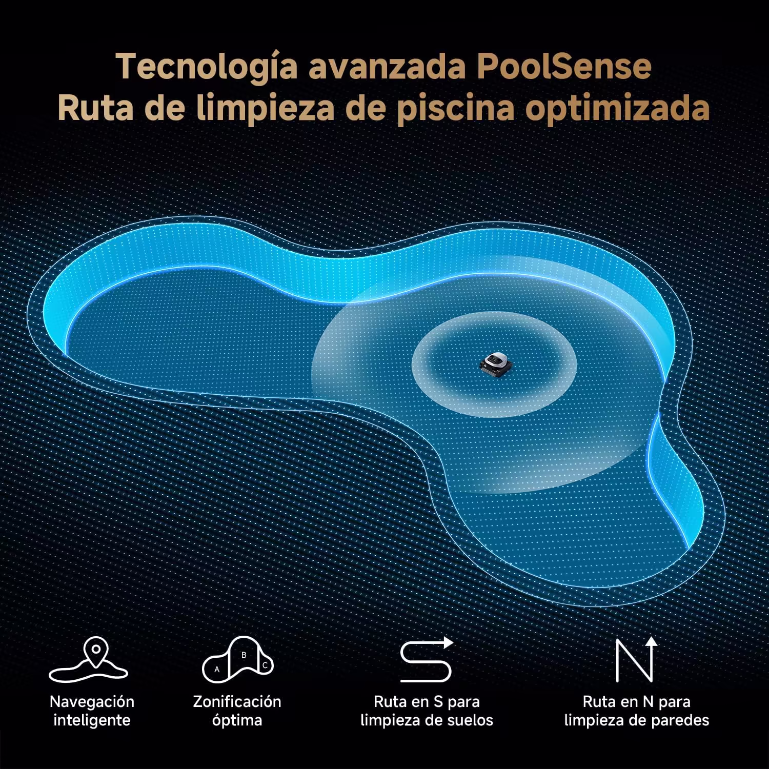 Navegación inteligente PoolSense™ 3D La tecnología PoolSense™ genera un mapa tridimensional de su piscina, ya sea enterrada o de superficie, hasta 15 metros de longitud. El robot optimiza sus trayectorias para cubrir cada superficie sin pasadas redundantes. El estacionamiento inteligente lo guía automáticamente al borde para una fácil recuperación.