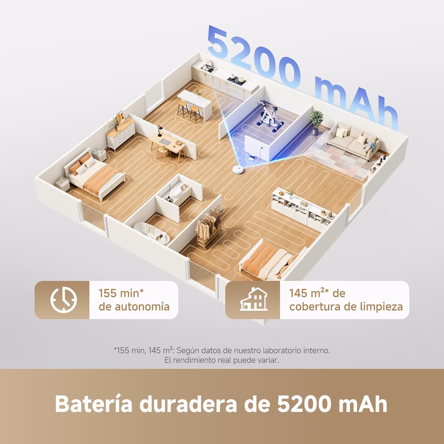 La estacion de acoplamiento gestiona el lavado automatico de mopas, el vaciado del deposito de polvo durante 75 dias y el secado con aire caliente para evitar olores. Smart Pathfinder garantiza una navegacion precisa y metodica, mientras que la aplicacion movil le permite programar, mapear y personalizar la limpieza habitacion por habitacion desde su smartphone.