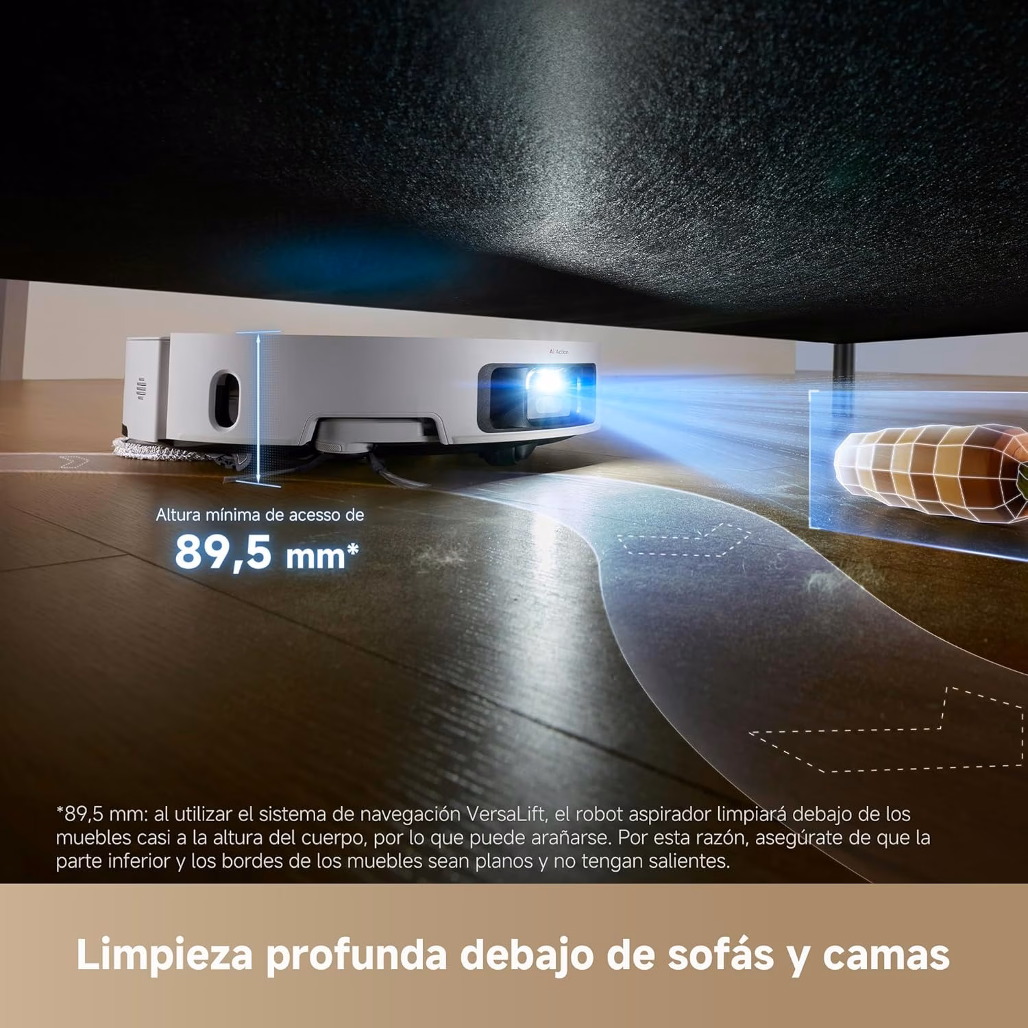 → Navegación VersaLift que se retrae a 89,5 mm de altura — permite limpiar bajo muebles bajos, a diferencia de los modelos X con torreta fija