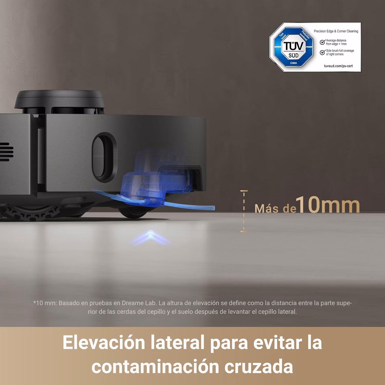 MopExtend RoboSwing — Limpieza de bordes al milimetro MopExtend RoboSwing es la funcion estrella del X40 Master. La mopa se extiende 4 cm mas alla del chasis para limpiar zocalos, bordes de muebles y esquinas de dificil acceso. El cepillo lateral se extiende 10 mm y se eleva 10 mm para esquivar obstaculos mientras barre los bordes. El cepillo principal de caucho se eleva 5 mm sobre alfombras.