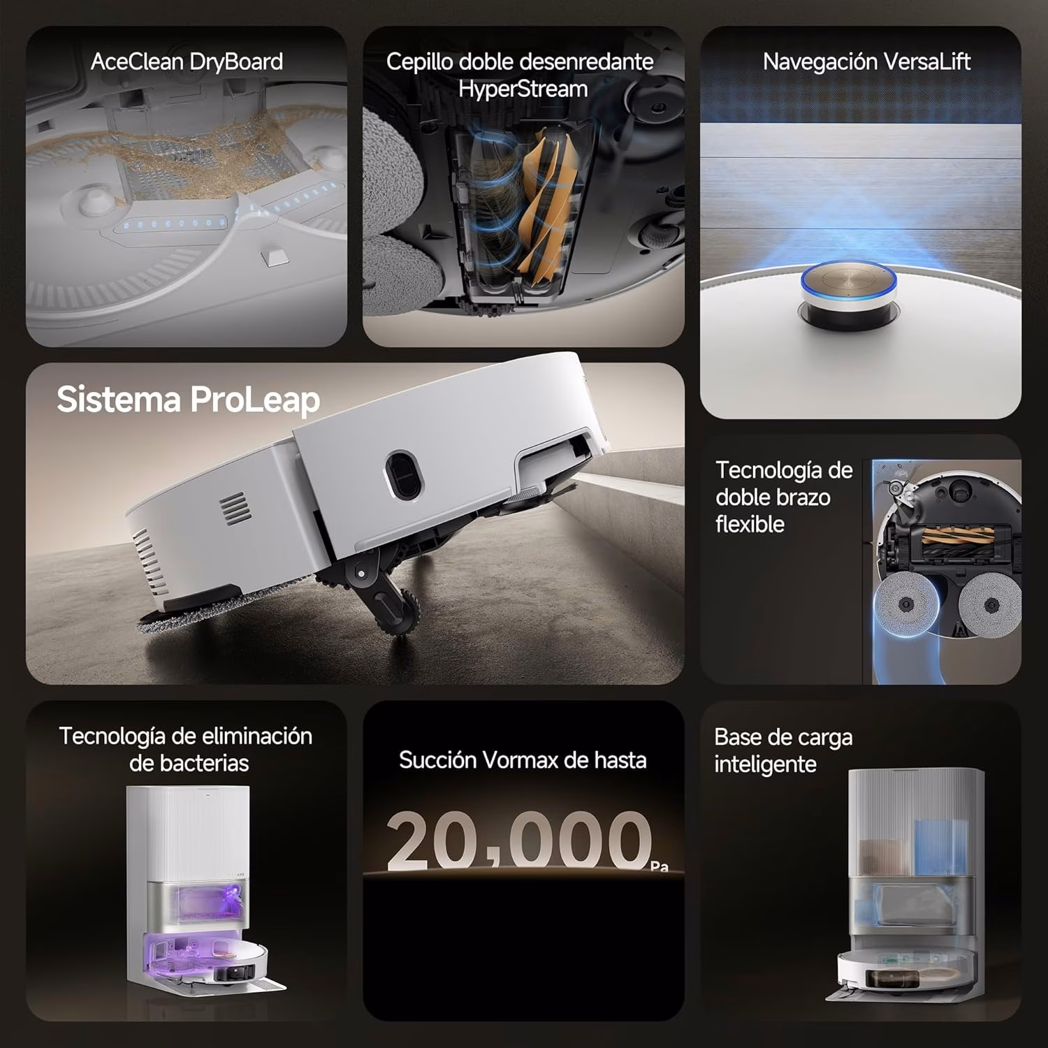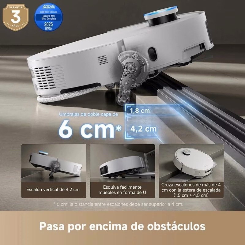 El X50 Ultra Complete es el robot aspirador más potente y completo de Dreame. Con 20.000 Pa de aspiración Vormax™, escalada ProLeap™ de 60 mm y vaciado automático de 100 días, domina la gama y se posiciona como la elección definitiva para hogares exigentes.