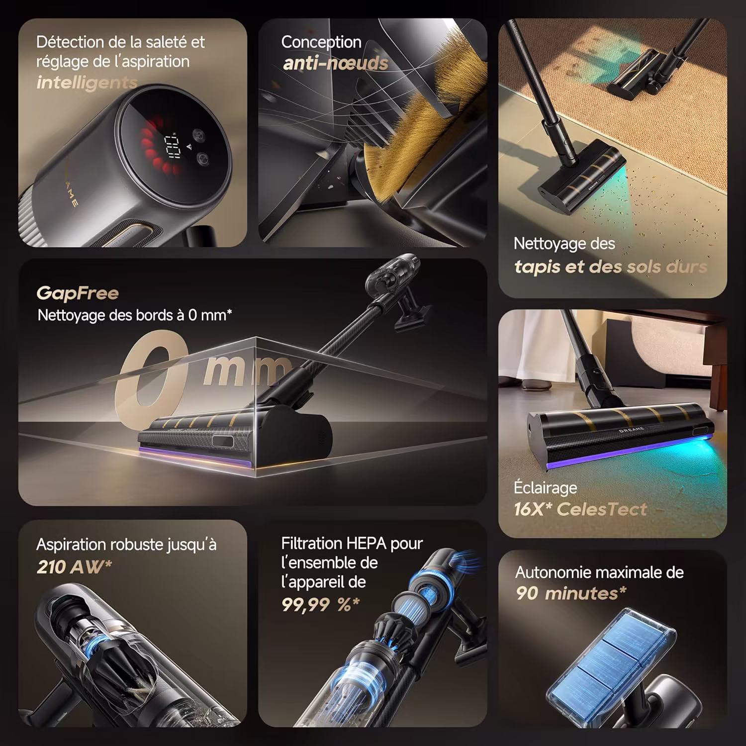 Avec 25 000 Pa et 210 AW de puissance d'aspiration fournis par un moteur brushless, le Dreame V20 offre des performances elevees sur toutes les surfaces. La brosse multi-surfaces CelesTect LED a poils en V est completee par un peigne anti-emmelement integre qui empeche les cheveux et poils d'animaux de s'enrouler autour du rouleau. Ce design ingenieux est particulierement apprecie dans les foyers avec des animaux de compagnie ou des personnes aux cheveux longs, car il elimine le besoin de nettoyer manuellement la brosse.
