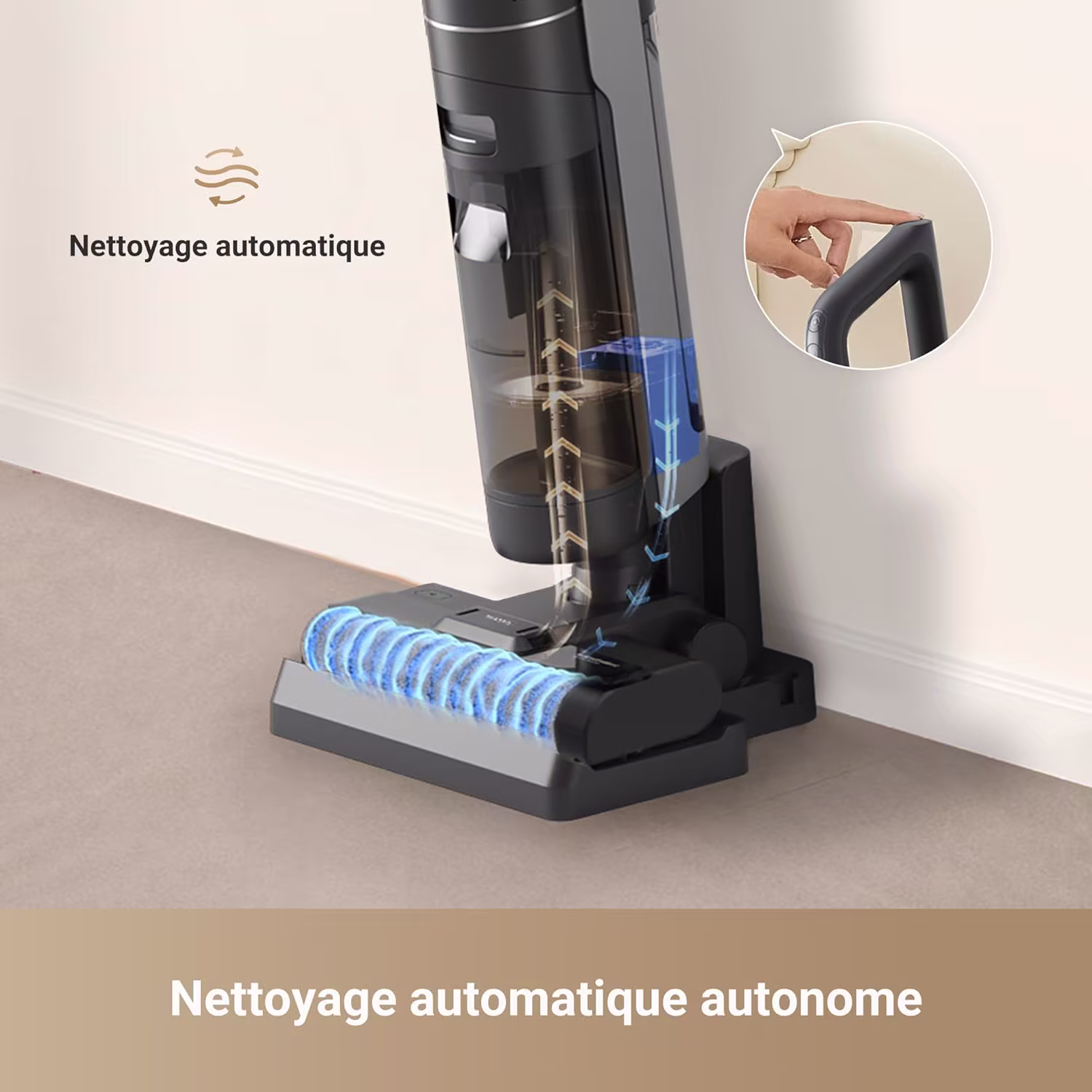 Apres chaque session de nettoyage, le Dreame H12S lance un cycle d'auto-nettoyage en une touche qui rince la brosse a l'eau propre. Le sechage a l'air chaud a 55°C se poursuit ensuite pendant une heure complete, garantissant une elimination totale de l'humidite residuelle. Ce sechage prolonge empeche la proliferation des bacteries et des moisissures, preservant la fraicheur de la brosse et evitant les mauvaises odeurs entre deux utilisations.