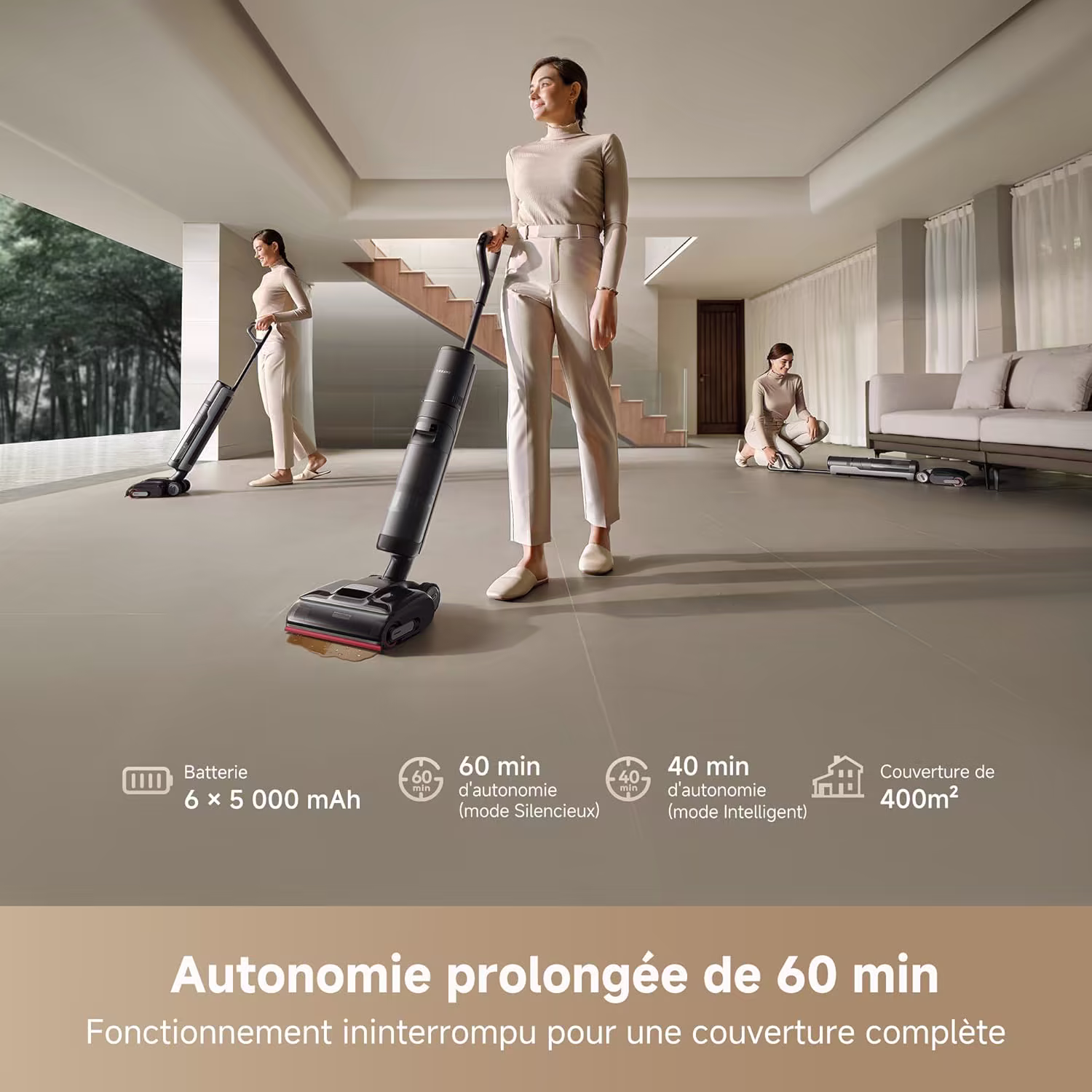 Le systeme GlideWheel electrique assiste le mouvement de l'appareil, reduisant considerablement l'effort physique lors du nettoyage. Le H15 Pro se manipule avec une legerete surprenante malgre ses 4,5 kg. Sa batterie de 4 500 mAh offre 60 minutes d'autonomie. L'application permet de personnaliser les parametres de nettoyage, les modes et l'intensite selon vos preferences et le type de sol.