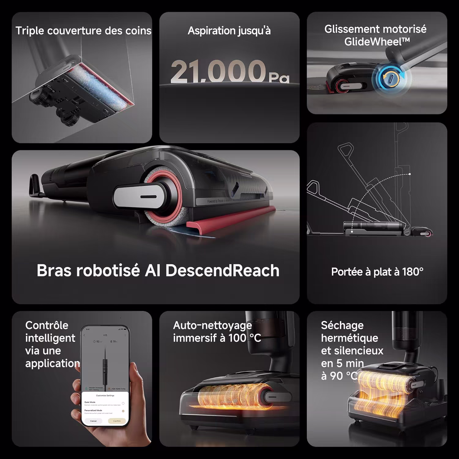 Le Dreame H15 Pro revolutionne le nettoyage des sols grace a son bras robotique AI DescendReach GapFree et sa couverture triple bords. Cette technologie lui permet d'atteindre les zones les plus difficiles d'acces : sous les meubles, le long des plinthes et dans les moindres recoins. Le design ultra-plat a 180 degres s'adapte a toutes les configurations d'interieur. Avec 21 000 Pa de puissance d'aspiration, il capture toutes les saletes en un seul passage.