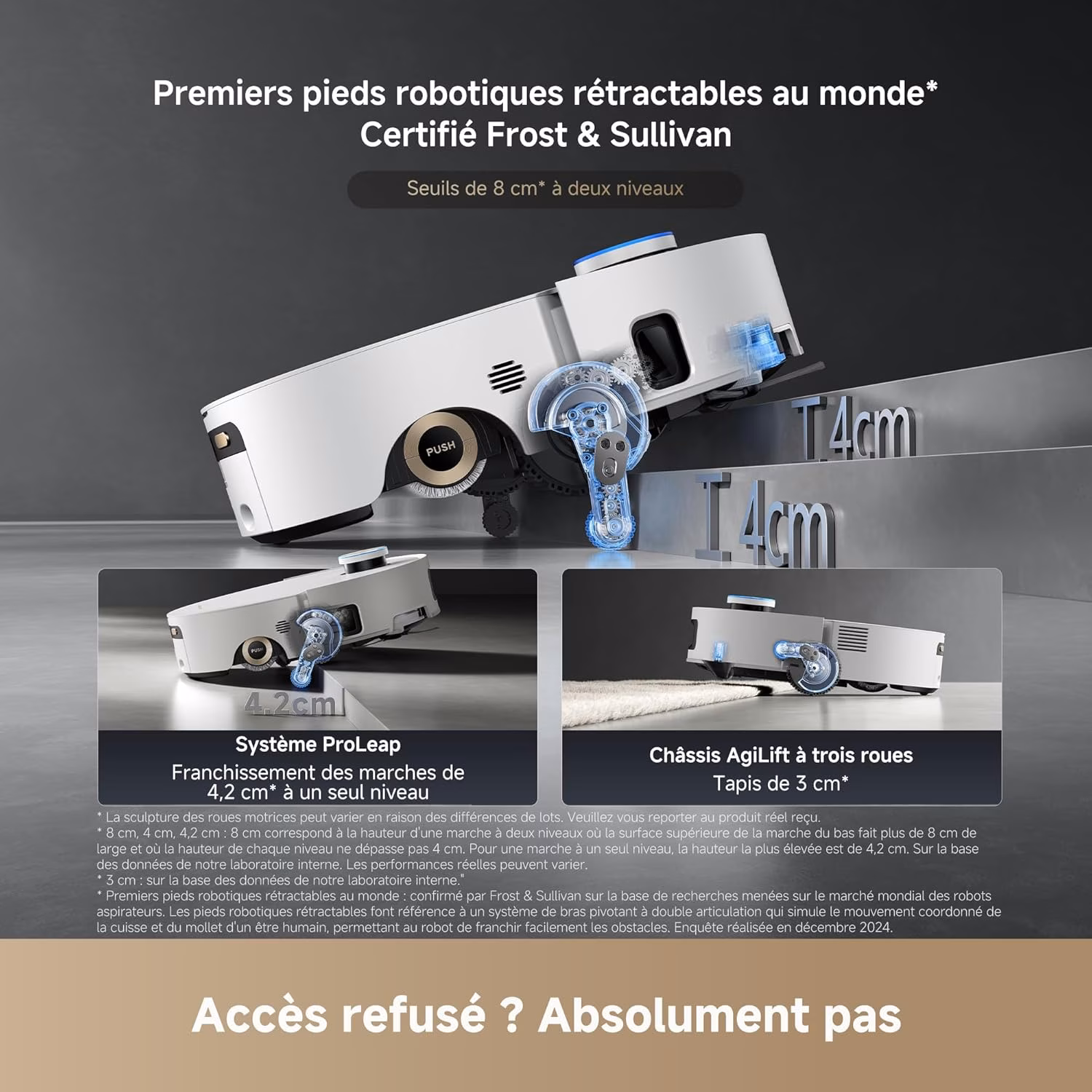 FlexRise™ — Suspension pneumatique et escalade 80 mm La suspension pneumatique FlexRise™ permet a l'Aqua10 de franchir des obstacles de 80 mm sans effort. Seuils de porte, rails, marches basses : le robot s'adapte au terrain. Combine avec l'OmniSight 2.0 a LDS retractable et navigation binoculaire, il detecte plus de 240 objets et navigue avec une precision chirurgicale.