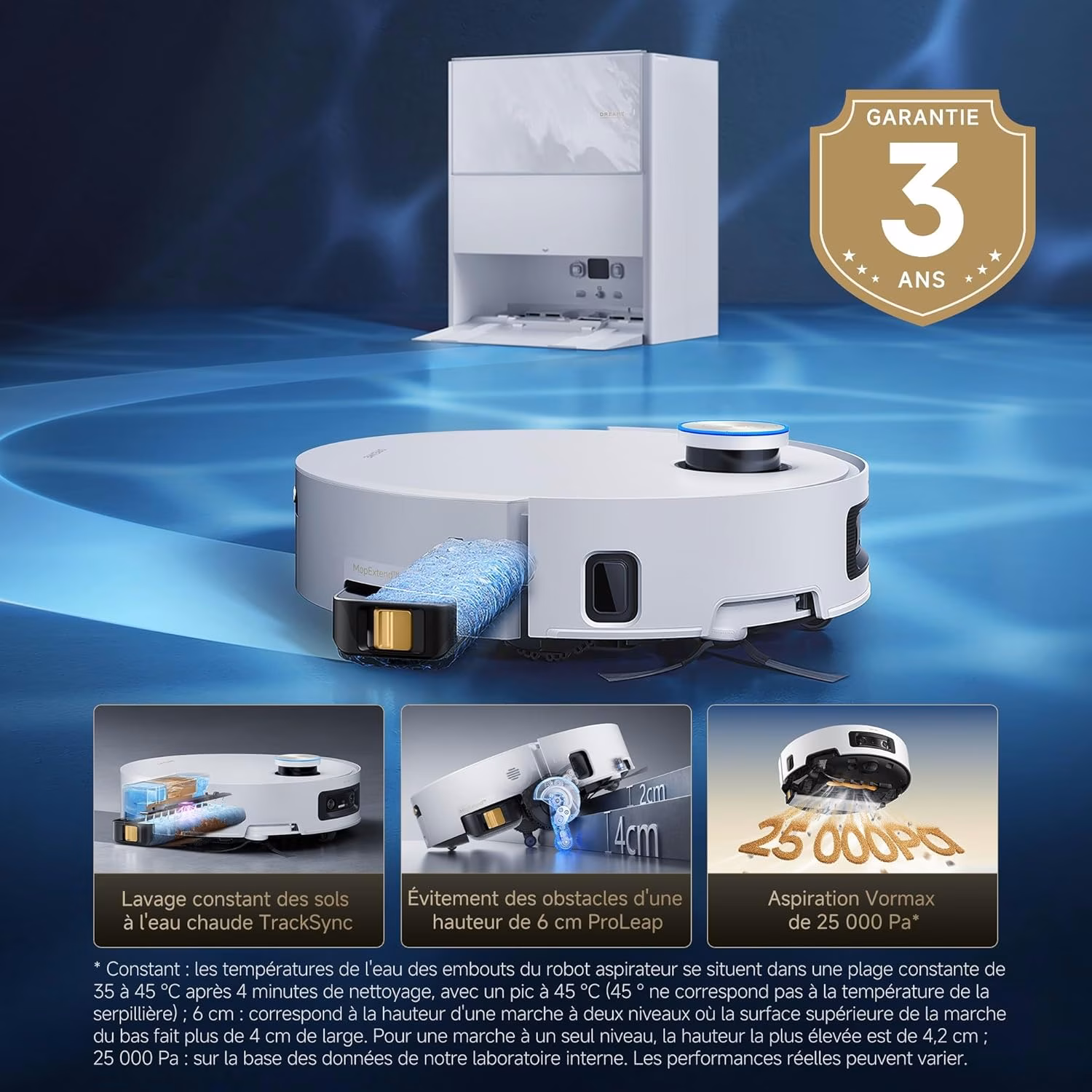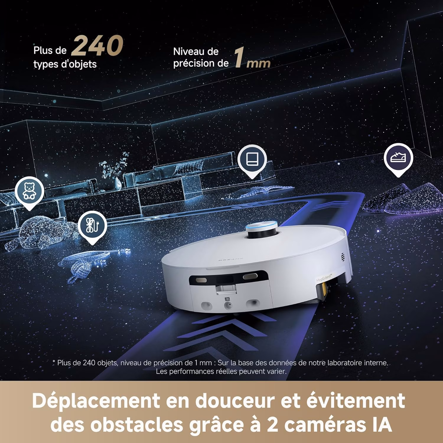 HyperStream™ double matiere et EasyLeap™ La brosse HyperStream™ combine caoutchouc et TPU pour une aspiration de 25 000 Pa sans emmelement. Les pieds robotiques retractables permettent au robot de franchir des obstacles de 60 mm, tandis que le systeme EasyLeap™ gere les seuils de porte jusqu'a 40 mm avec une facilite remarquable. La serpilliere se detache ou se leve automatiquement a l'approche des tapis.