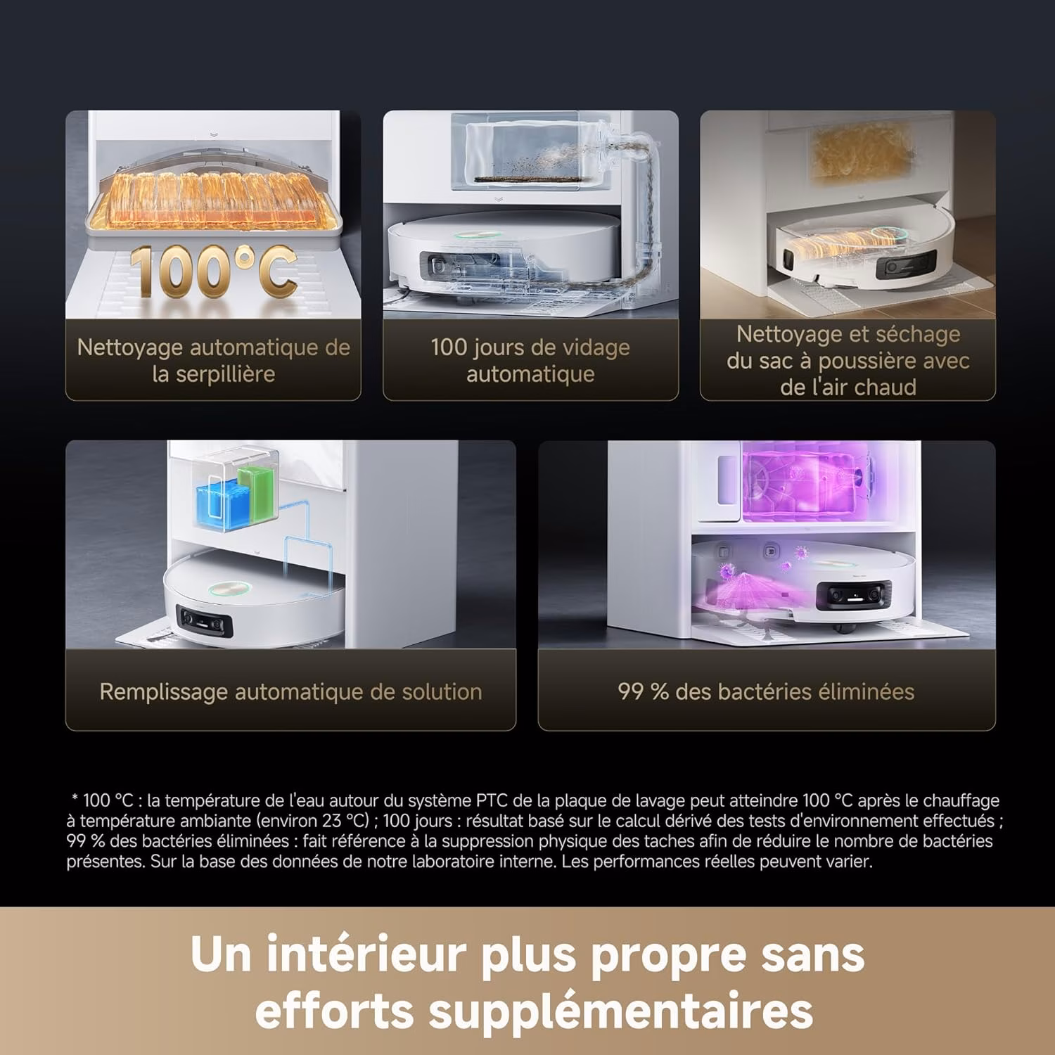 PowerDock™ 100°C — Auto-vidage et rechargement automatique La station PowerDock™ lave la chenille a 100°C pour une desinfection totale, seche a l'air chaud et vide le bac a poussiere automatiquement pendant 100 jours. Elle recharge egalement l'eau et la solution nettoyante automatiquement. Zero intervention pendant des semaines entieres.
