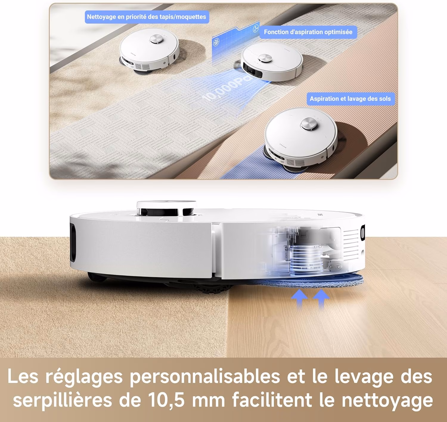 → Aspiration de 10 000 Pa — inférieure au L10s Ultra Gen 3 (25 000 Pa), au X40 (12 000 Pa) et au L40s Pro Ultra (15 000 Pa)