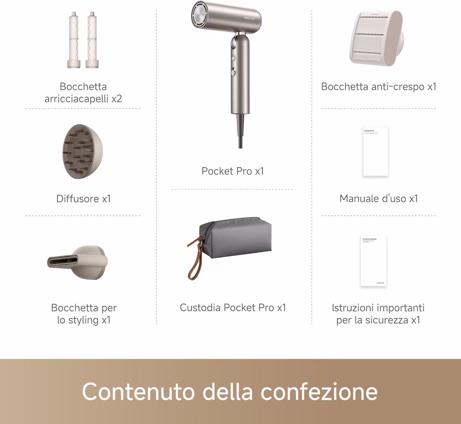 Il Dreame Pocket Pro e il campione da viaggio senza compromessi. In un corpo di 300 g e 50 mm, racchiude la potenza di un asciugacapelli classico con 4 accessori e protezione termica avanzata.